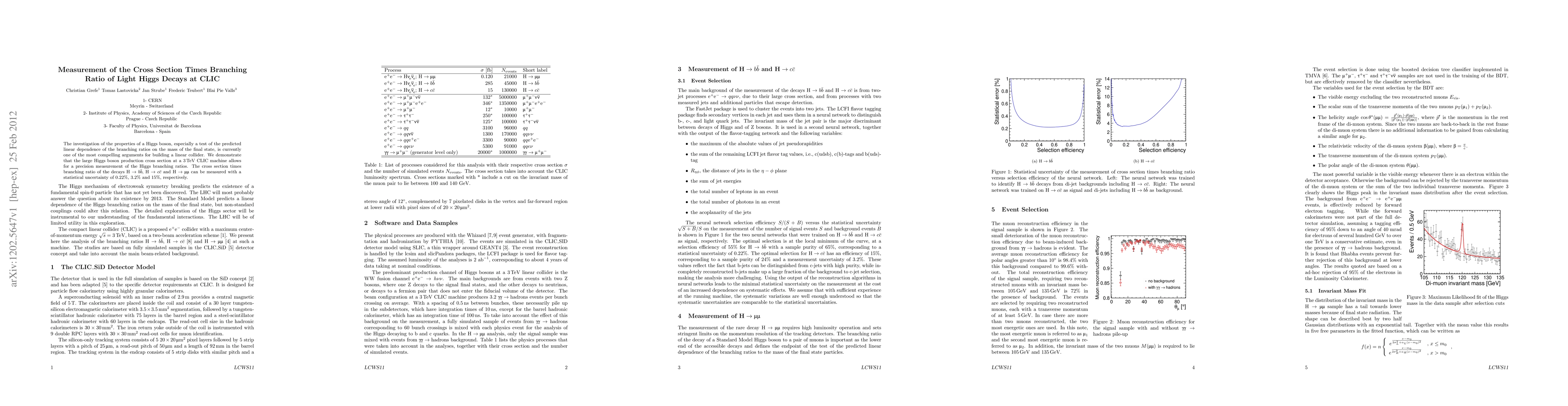 This paper investigates the precision measurement of the cross section times branching ratio for light Higgs boson decays at a CLIC linear collider operating at 3 TeV. The study demonstrates that the large production cross section enables accurate measurements of the branching ratios for decays H → bb, H → cc, and H → μμ with statistical uncertainties of 0.22%, 3.2%, and 15%, respectively.