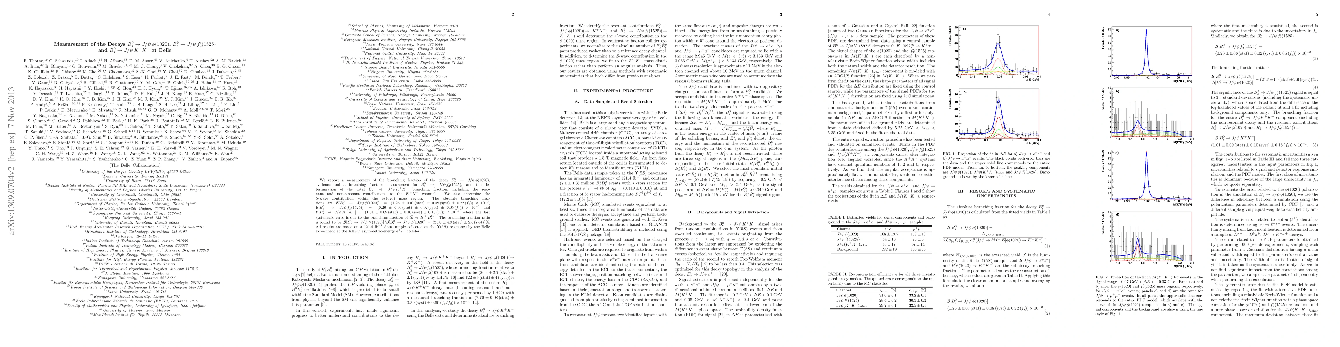 The Belle experiment measured the branching fractions for the decays $B^0_s\to J/\psi\,\phi(1020)$, $B^0_s\to J/\psi\,f'_2(1525)$, and $B^0_s\to J/\psi\,K^+K^-$, finding $\mathcal{B}[B^0_s\to J/\psi\,\phi(1020)] = (1.25 \pm 0.37)\times 10^{-3}$ and $\mathcal{B}[B^0_s\to J/\psi\,K^+K^-] = (1.01 \pm 0.27)\times 10^{-3}$. The ratio $\mathcal{B}[B^0_s\to J/\psi\,f'_2(1525)]/\mathcal{B}[B^0_s\to J/\psi\,\phi(1020)]$ is $(21.5\pm 5.4)\%$.