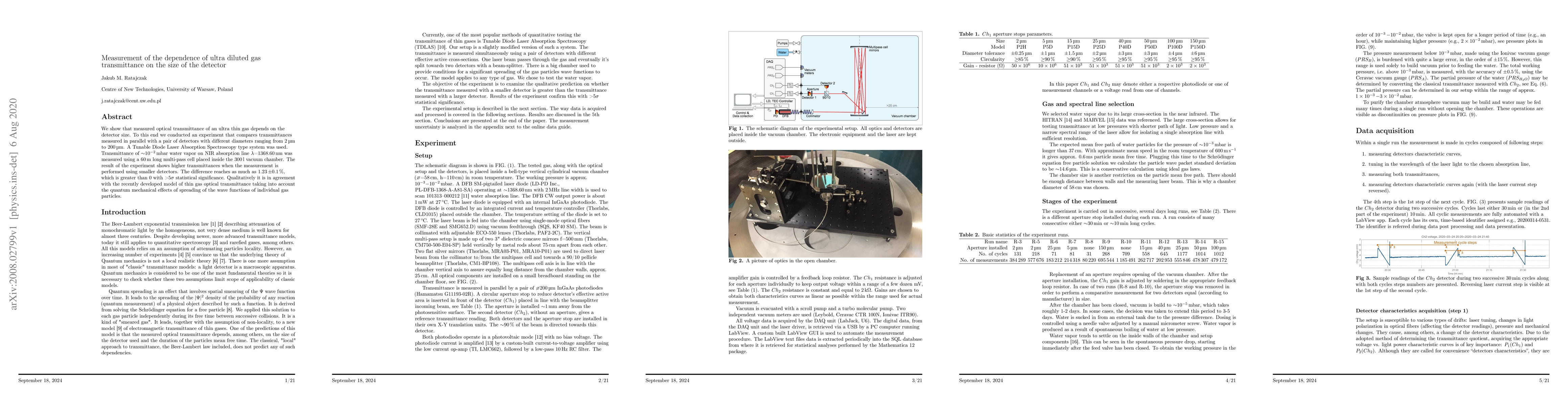We show that measured optical transmittance of an ultra thin gas depends on the detector size. To this end we conducted an experiment that compares transmittances measured in parallel with a pair of detectors with different diameters ranging from 2 ${\mu}$m to 200 ${\mu}$m. A Tunable Diode Laser Absorption Spectroscopy type system was used. Transmittance of $\sim$1e-2 mbar water vapor on NIR absorption line $\lambda$=1368.60 nm was measured using a 60 m long multi-pass cell placed inside the 300 l vacuum chamber. The result of the experiment shows higher transmittances when the measurement is performed using smaller detectors. The difference reaches as much as 1.23 $\pm$0.1 %, which is greater than 0 with >5$\sigma$ statistical significance. Qualitatively it is in agreement with the recently developed model of thin gas optical transmittance taking into account the quantum mechanical effects of spreading of the wave functions of individual gas particles.