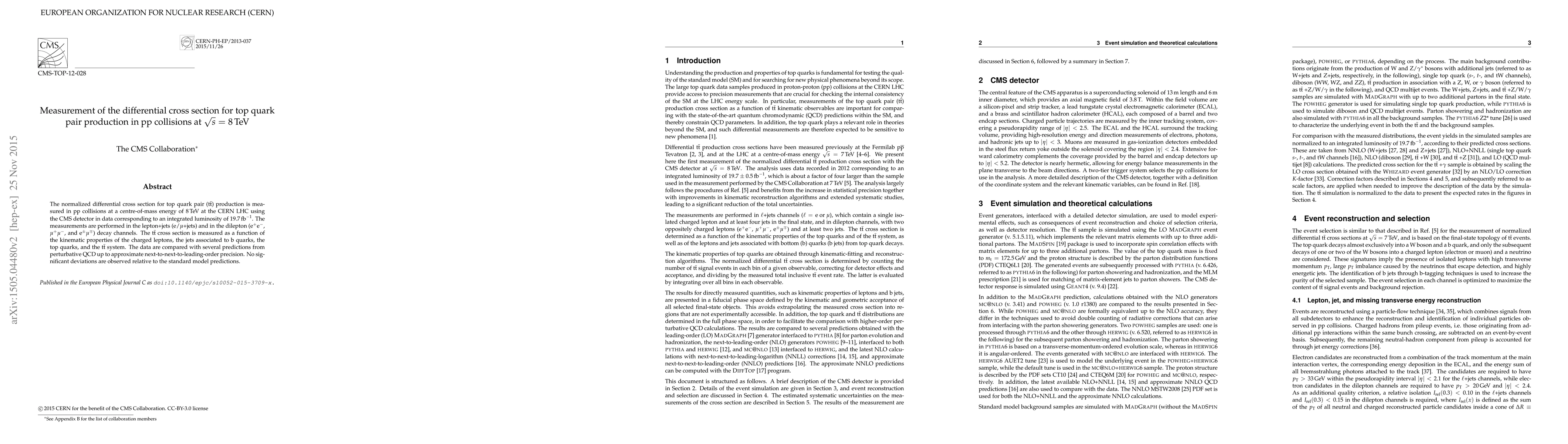 The normalized differential cross section for top quark pair (tt-bar) production is measured in pp collisions at a centre-of-mass energy of 8 TeV at the CERN LHC using the CMS detector in data corresponding to an integrated luminosity of 19.7 inverse femtobarns. The measurements are performed in the lepton + jets (e/mu + jets) and in the dilepton (e+e-, mu+mu-, and e+-mu-+) decay channels. The tt-bar cross section is measured as a function of the kinematic properties of the charged leptons, the jets associated to b quarks, the top quarks, and the tt-bar system. The data are compared with several predictions from perturbative quantum chromodynamics up to approximate next-to-next-to-leading-order precision. No significant deviations are observed relative to the standard model predictions.