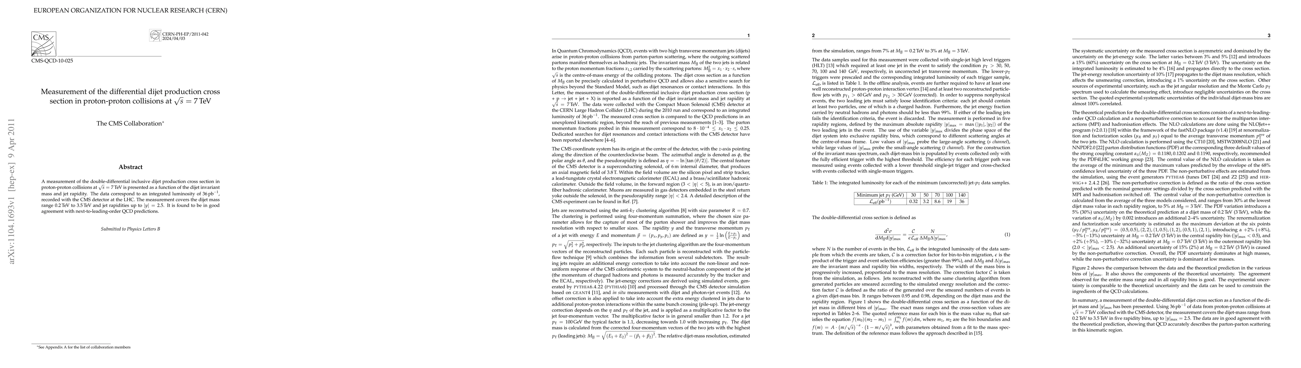This paper reports a measurement of the differential dijet production cross section in proton-proton collisions at 7 TeV, using data from the CMS detector at the LHC. The results, covering dijet masses from 0.2 to 3.5 TeV and jet rapidities up to |y|=2.5, align well with next-to-leading-order QCD predictions.