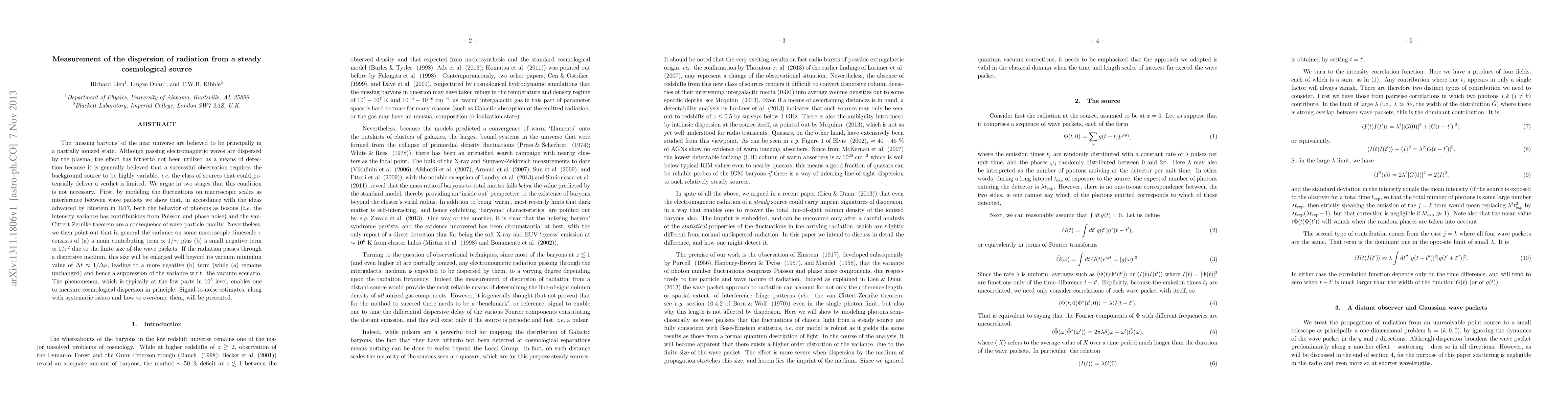 The `missing baryons' of the near universe are believed to be principally in a partially ionized state. Although passing electromagnetic waves are dispersed by the plasma, the effect has hitherto not been utilized as a means of detection because it is generally believed that a successful observation requires the background source to be highly variable, \ie~the class of sources that could potentially deliver a verdict is limited. We argue in two stages that this condition is not necessary. First, by modeling the fluctuations on macroscopic scales as interference between wave packets we show that, in accordance with the ideas advanced by Einstein in 1917, both the behavior of photons as bosons (\ie~the intensity variance has contributions from Poisson and phase noise) and the van-Cittert-Zernike theorem are a consequence of wave-particle duality. Nevertheless, we then point out that in general the variance on some macroscopic timescale $\tau$ consists of (a) a main contributing term $\propto 1/\tau$, plus (b) a small negative term $\propto 1/\tau^2$ due to the finite size of the wave packets. If the radiation passes through a dispersive medium, this size will be enlarged well beyond its vacuum minimum value of $\Delta t \approx 1/\Delta\nu$, leading to a more negative (b) term (while (a) remains unchanged) and hence a suppression of the variance w.r.t. the vacuum scenario. The phenomenon, which is typically at the few parts in 10$^5$ level, enables one to measure cosmological dispersion in principle. Signal-to-noise estimates, along with systematic issues and how to overcome them, will be presented.