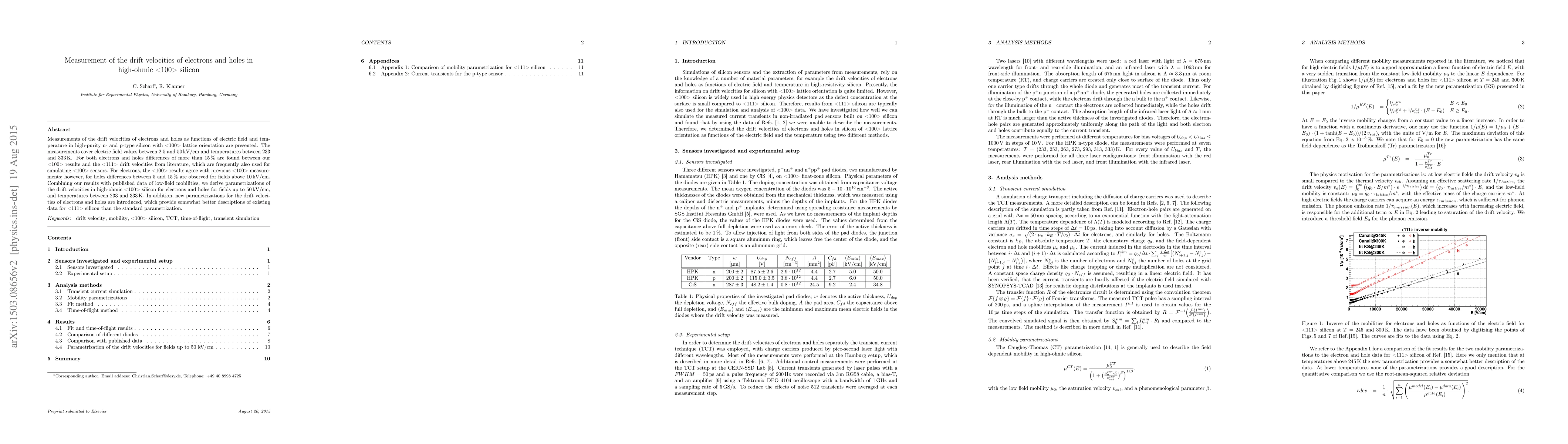 Researchers measured electron and hole drift velocities in high-purity silicon with <100> orientation under various electric fields and temperatures, revealing significant differences from commonly used literature values.