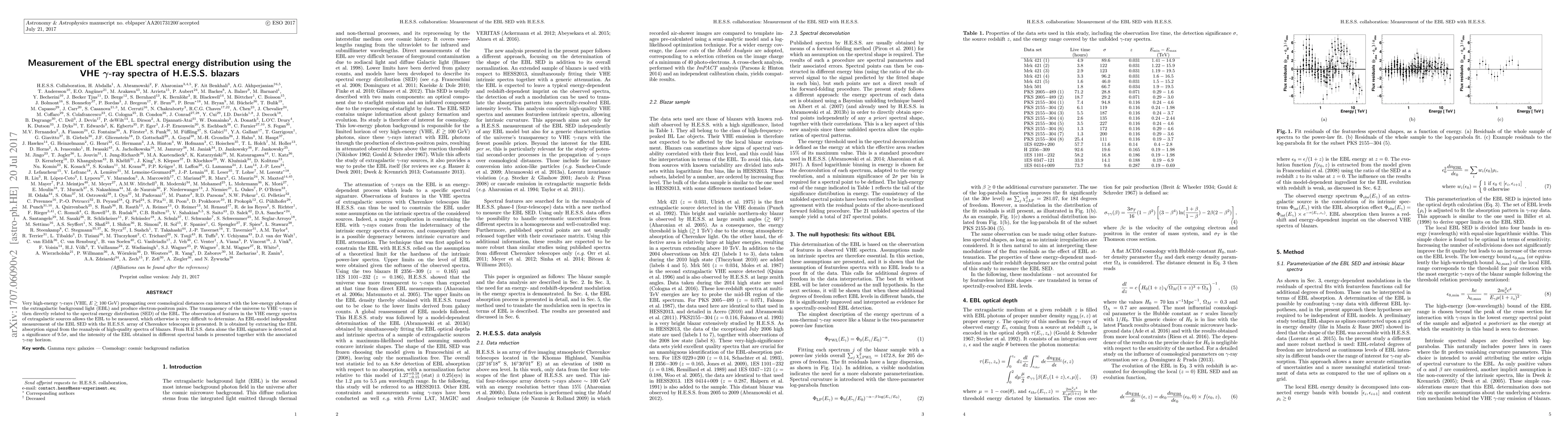 Researchers measure the spectral energy distribution of extragalactic background light (EBL) using high-energy gamma-ray spectra from H.E.S.S. blazars, detecting a 9.5 sigma EBL signature.