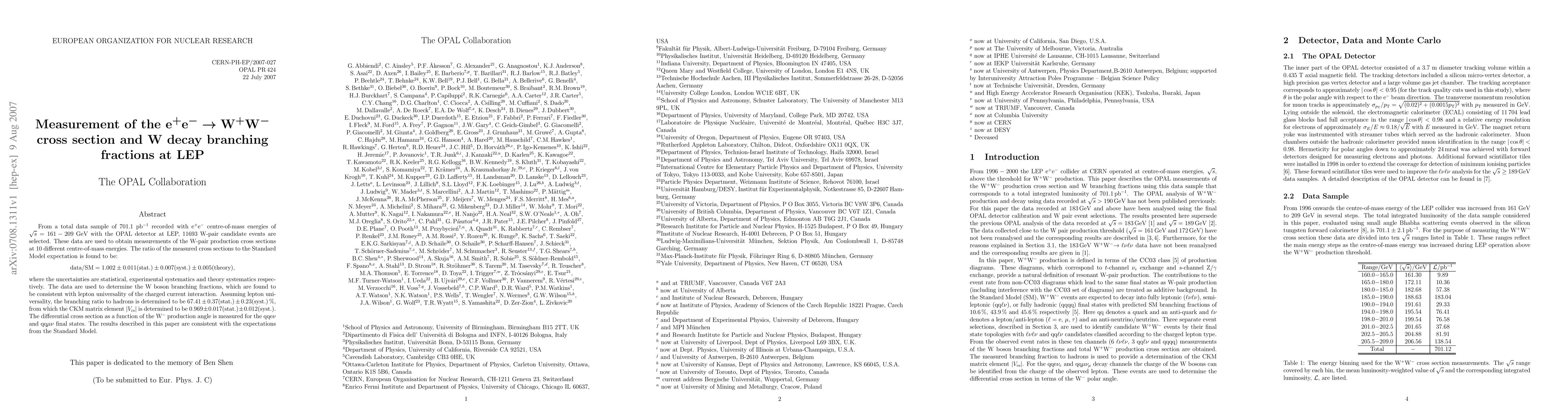This paper reports measurements of the e+e- -> W+W- cross section at LEP, finding the ratio of measured to expected cross sections to be 1.002 ± 0.011, consistent with the Standard Model. It also determines W boson decay branching fractions, confirming lepton universality and determining the CKM matrix element Vcs.