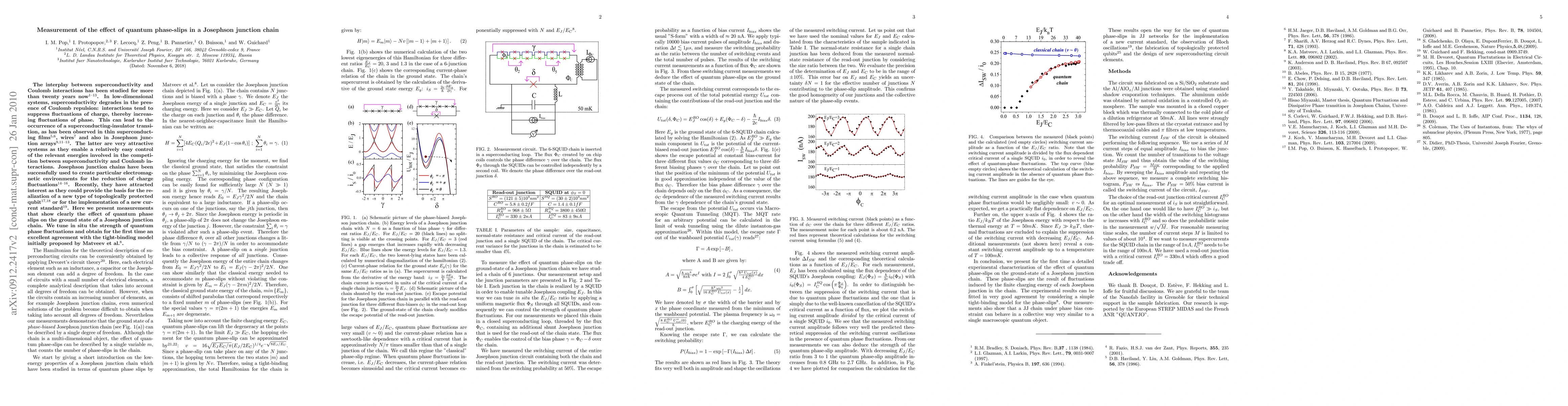 This paper experimentally investigates quantum phase slips in a one-dimensional Josephson Junction chain, where each junction is a SQUID for tunable coupling. The ground state is determined via switching current measurements, and results align with a tight binding Hamiltonian model incorporating quantum phase-slip effects.