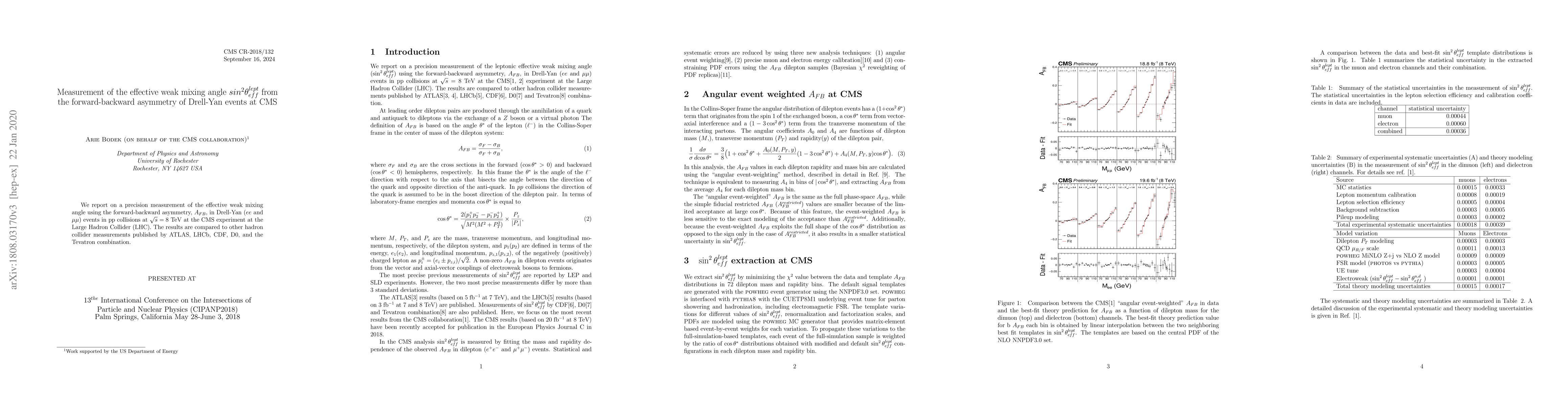 We report on a precision measurement of the effective weak mixing angle using the forward-backward asymmetry, $A_{FB}$, in Drell-Yan ($ee$ and $\mu\mu$) events in pp collisions at $\sqrt{s}=8~\mathrm{TeV}$ at the CMS experiment at the Large Hadron Collider (LHC). The results are compared to other hadron collider measurements published by ATLAS, LHCb, CDF, D0 and Tevatron combination.