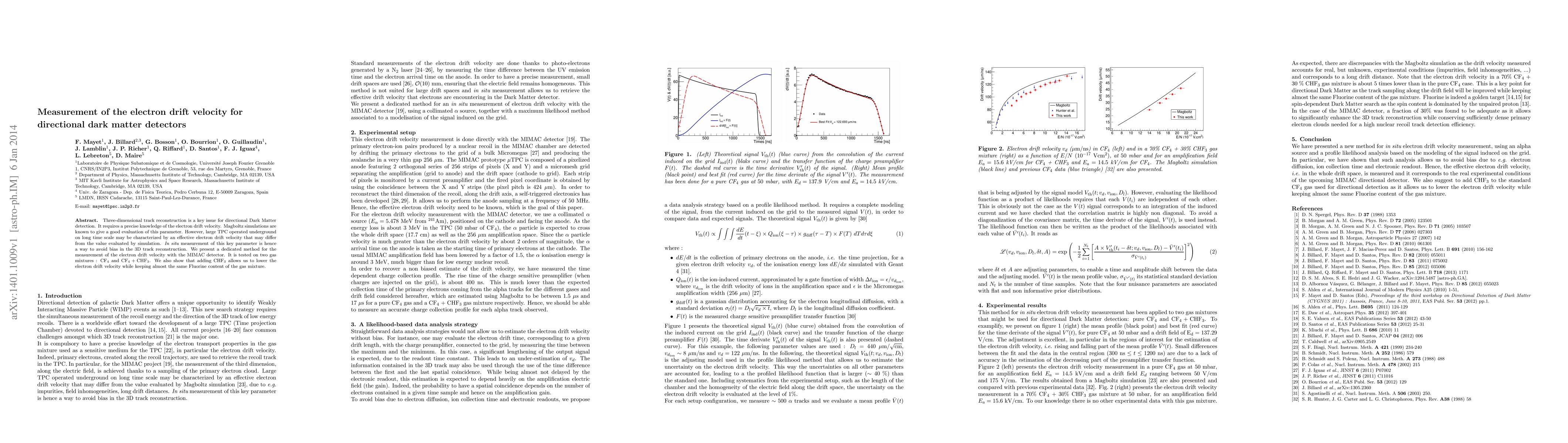 This paper presents a method for measuring the electron drift velocity in directional dark matter detectors using the MIMAC detector, focusing on the gas mixtures $\rm CF_4$ and $\rm CF_4+CHF_3$. It demonstrates that adding $\rm CHF_3$ can reduce the drift velocity while maintaining similar fluorine content, crucial for accurate three-dimensional track reconstruction.