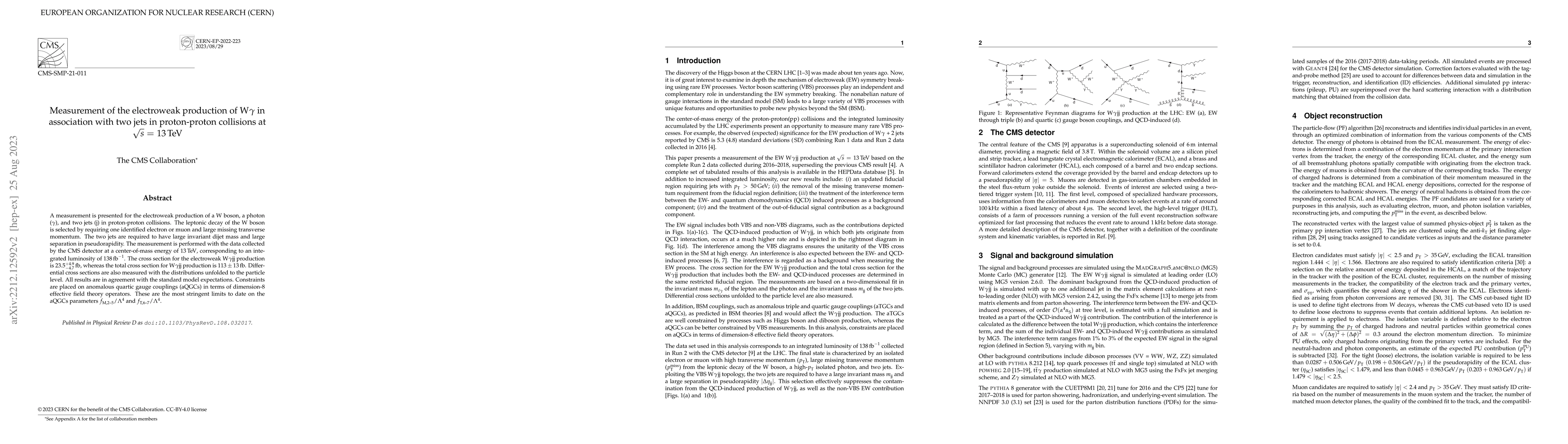 This paper reports a measurement of the electroweak production of W bosons, photons, and two jets in proton-proton collisions at 13 TeV, using the CMS detector. The results show agreement with standard model predictions and provide stringent limits on anomalous quartic gauge couplings.