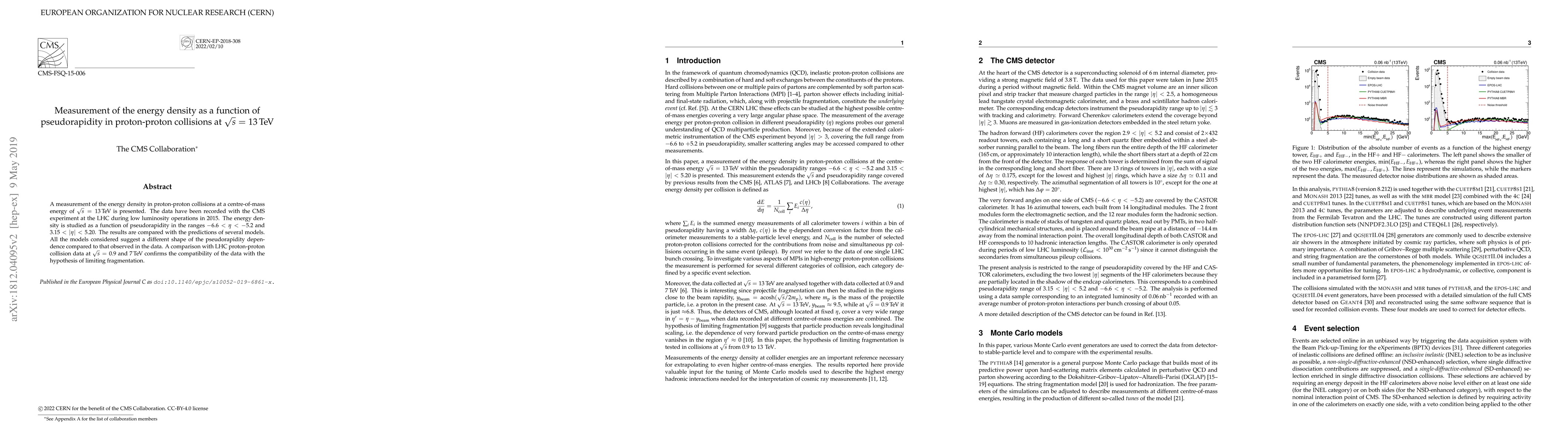 This paper reports on the energy density measurements in proton-proton collisions at $\sqrt{s} = 13$ TeV, analyzed as a function of pseudorapidity. The CMS experiment data show discrepancies between observed pseudorapidity dependence and model predictions, while aligning with limiting fragmentation hypotheses from lower energy collisions.