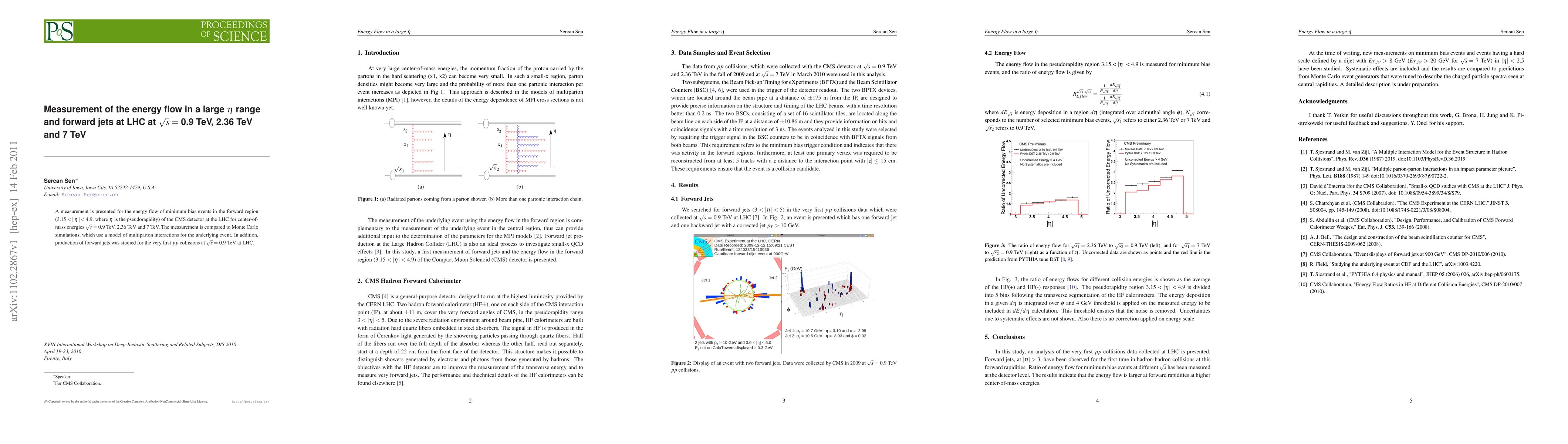 This paper measures the energy flow in minimum bias events in the forward region of the CMS detector at the LHC across three energies, comparing results to Monte Carlo simulations. Additionally, it reports on the production of forward jets in the first pp collisions at 0.9 TeV.