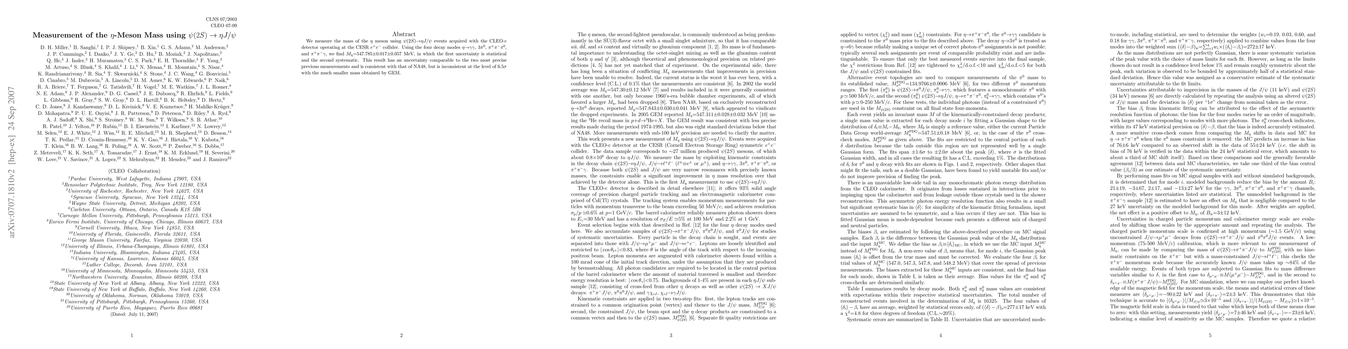 We measure the mass of the eta meson using psi(2S) --> eta J/psi events acquired with the CLEO-c detector operating at the CESR e+e- collider. Using the four decay modes eta --> gamma gamma, 3pi0, pi+pi-pi0, and pi+pi-gamma, we find M(eta)=547.785 +- 0.017 +- 0.057 MeV, in which the first uncertainty is statistical and the second systematic. This result has an uncertainty comparable to the two most precise previous measurements and is consistent with that of NA48, but is inconsistent at the level of 6.5sigma with the much smaller mass obtained by GEM.