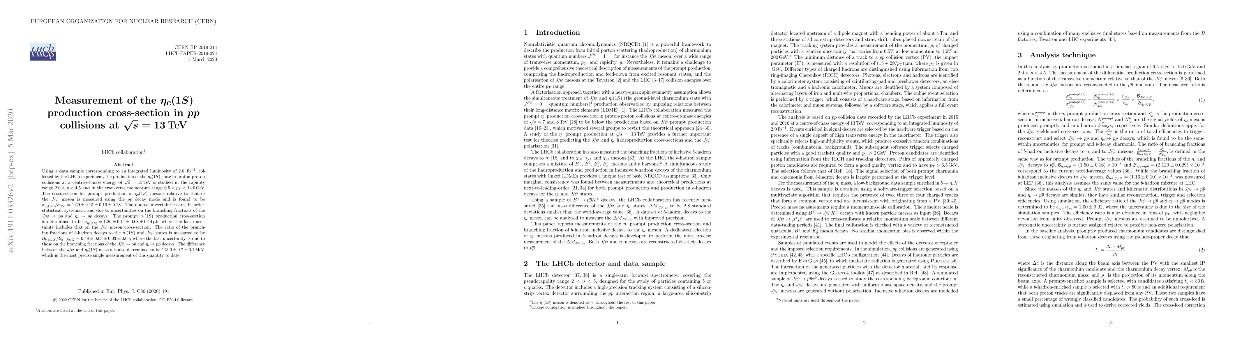 Using a data sample corresponding to an integrated luminosity of $2.0\,fb^{-1}$, collected by the LHCb experiment, the production of the $\eta_c(1S)$ state in proton-proton collisions at a centre-of-mass energy of $\sqrt{s}=13 \text{ TeV}$ is studied in the rapidity range ${2.0 < y < 4.5}$ and in the transverse momentum range ${6.5 < p_{T} < 14.0\text{ GeV}}$. The cross-section for prompt production of $\eta_c(1S)$ mesons relative to that of the $J/\psi$ meson is measured using the ${p\bar{p}}$ decay mode and is found to be ${\sigma_{\eta_c(1S)}/\sigma_{J/\psi} = 1.69 \pm 0.15 \pm 0.10 \pm 0.18}$. The quoted uncertainties are, in order, statistical, systematic and due to uncertainties on the branching fractions of the ${J/\psi\to p \bar{p}}$ and ${\eta_c\to p \bar{p}}$ decays. The prompt $\eta_c(1S)$ production cross-section is determined to be ${\sigma_{\eta_c(1S)} = 1.26 \pm 0.11\pm 0.08 \pm 0.14 \,\mu b}$, where the last uncertainty includes that on the ${J/\psi}$ meson cross-section. The ratio of the branching fractions of $b$-hadron decays to the $\eta_c(1S)$ and ${J/\psi}$ states is measured to be ${\mathcal{B}_{b\to\eta_c X}/\mathcal{B}_{b\to J/\psi X} = 0.48 \pm 0.03 \pm 0.03 \pm 0.05}$, where the last uncertainty is due to those on the branching fractions of the ${J/\psi \to p \bar{p}}$ and ${\eta_c\to p \bar{p}}$ decays. The difference between the ${J/\psi}$ and $\eta_c(1S)$ masses is also determined to be ${113.0 \pm 0.7 \pm 0.1\text{ MeV}}$, which is the most precise single measurement of this quantity to date.