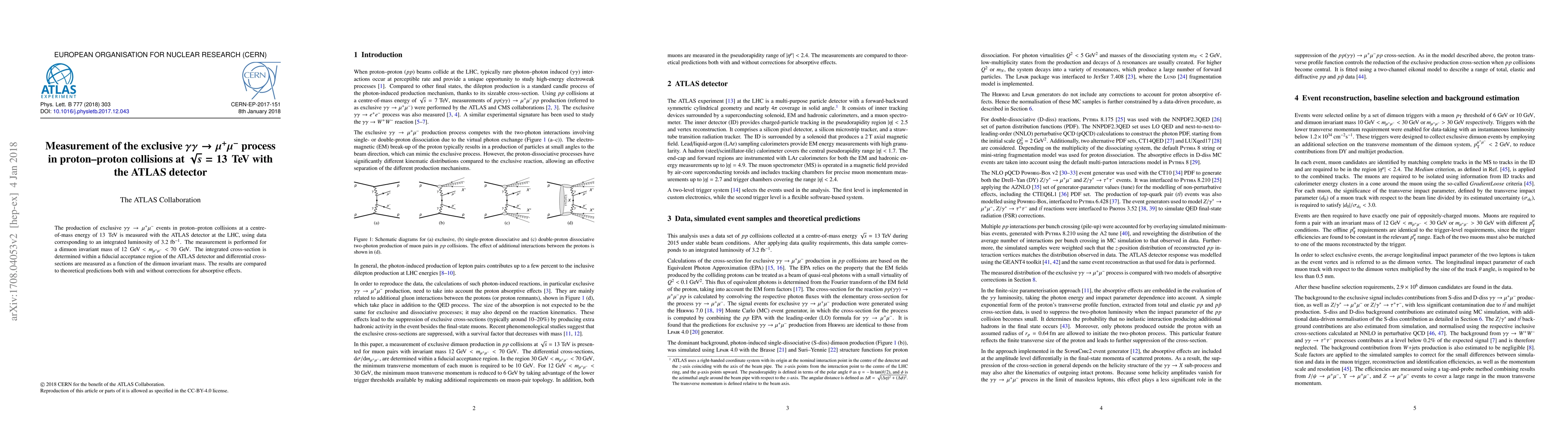 This paper reports the measurement of exclusive $\gamma \gamma \rightarrow \mu^+ \mu^-$ events in proton-proton collisions at 13 TeV using the ATLAS detector, with results compared to theoretical predictions, including absorptive corrections. The study focuses on dimuon invariant masses between 12 GeV and 70 GeV.