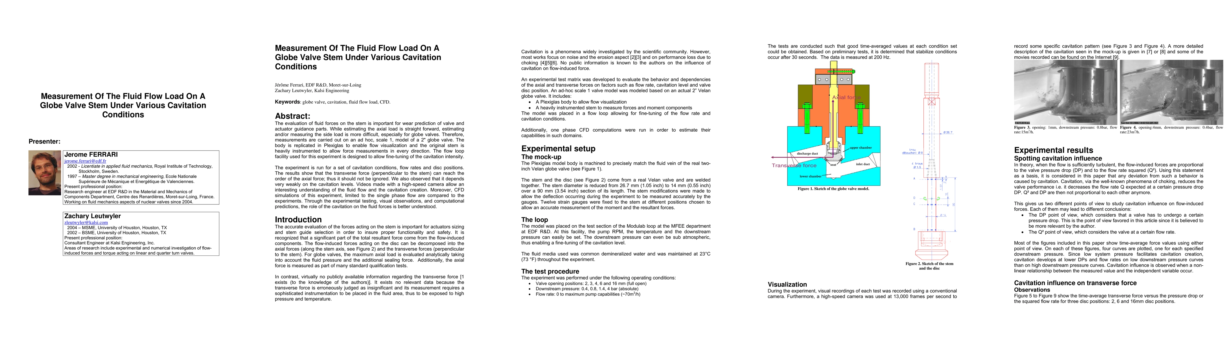 This study measures the fluid flow load on a globe valve stem under various cavitation conditions, finding that transverse forces can be significant and comparable to axial forces. The experiment, combined with CFD simulations and high-speed video analysis, reveals the cavitation's minimal impact on transverse forces and enhances understanding of fluid flow dynamics.