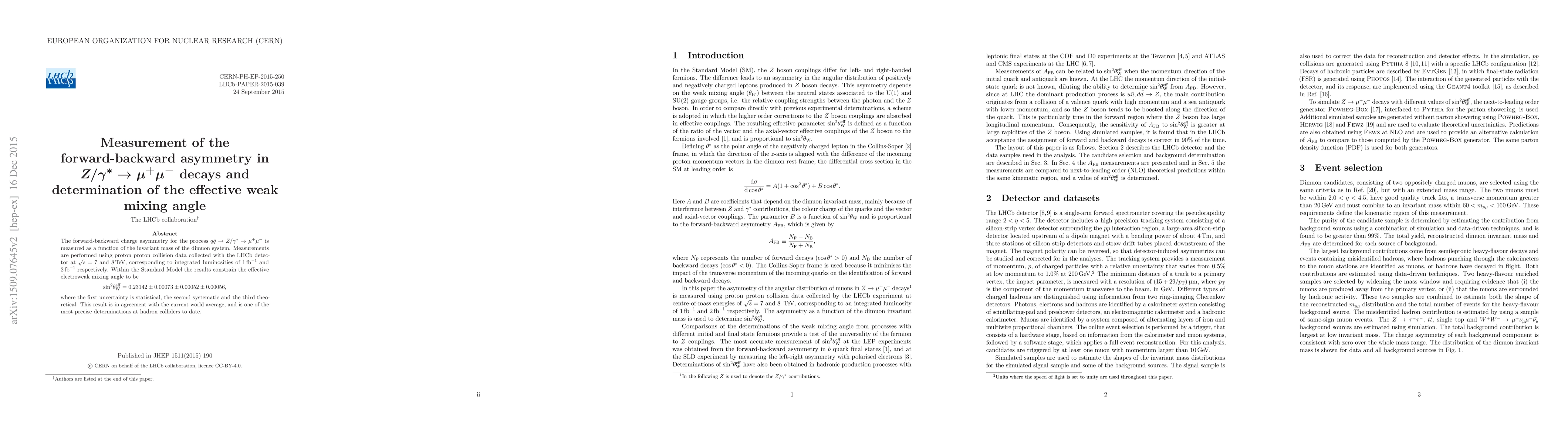 This paper measures the forward-backward charge asymmetry in $Z/\gamma^{\ast} \rightarrow \mu^{+}\mu^{-}$ decays using LHCb data, determining the effective weak mixing angle as $sin^{2}\theta_{W}^{eff} = 0.23142 \pm 0.00073 \pm 0.00052 \pm 0.00056$. The result aligns with the current world average and represents one of the most precise measurements at hadron colliders.