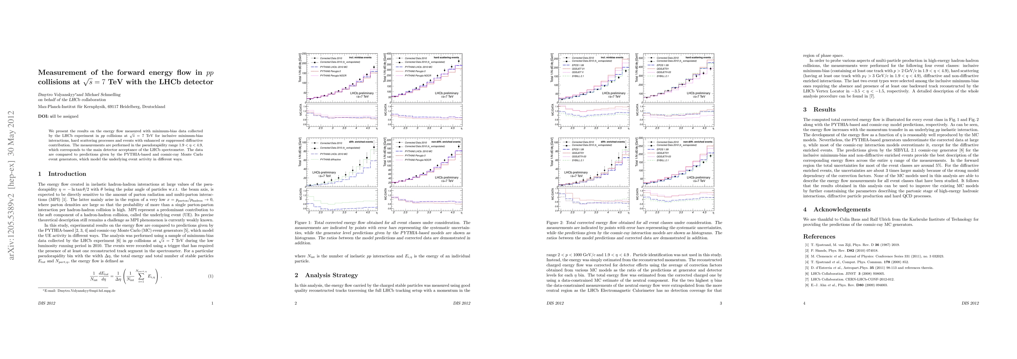 This paper reports on the measurement of forward energy flow in proton-proton collisions at 7 TeV using the LHCb detector, focusing on minimum-bias interactions and comparing results to predictions from PYTHIA-based and cosmic-ray Monte Carlo event generators. The study covers the pseudorapidity range 1.9 < η < 4.9.
