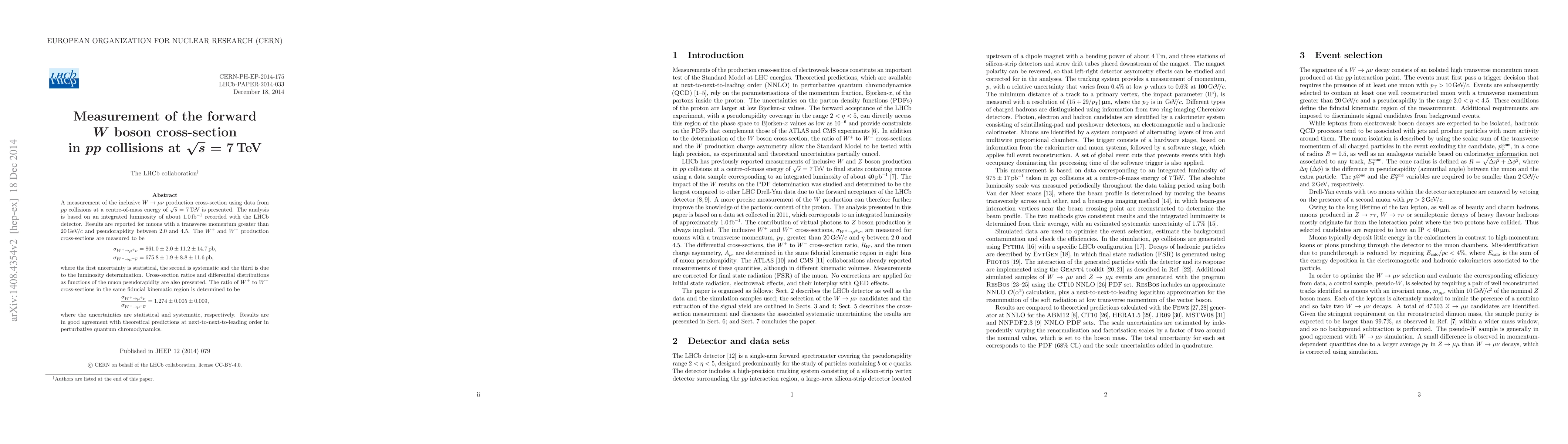 This paper measures the forward $W$ boson cross-section in $pp$ collisions at $7$ TeV using LHCb data, finding $\sigma_{W^{+}} = 861.0 \pm 14.7$ pb and $\sigma_{W^{-}} = 675.8 \pm 11.6$ pb, with the ratio $\sigma_{W^{+}}/\sigma_{W^{-}} = 1.274 \pm 0.014$, consistent with QCD predictions.