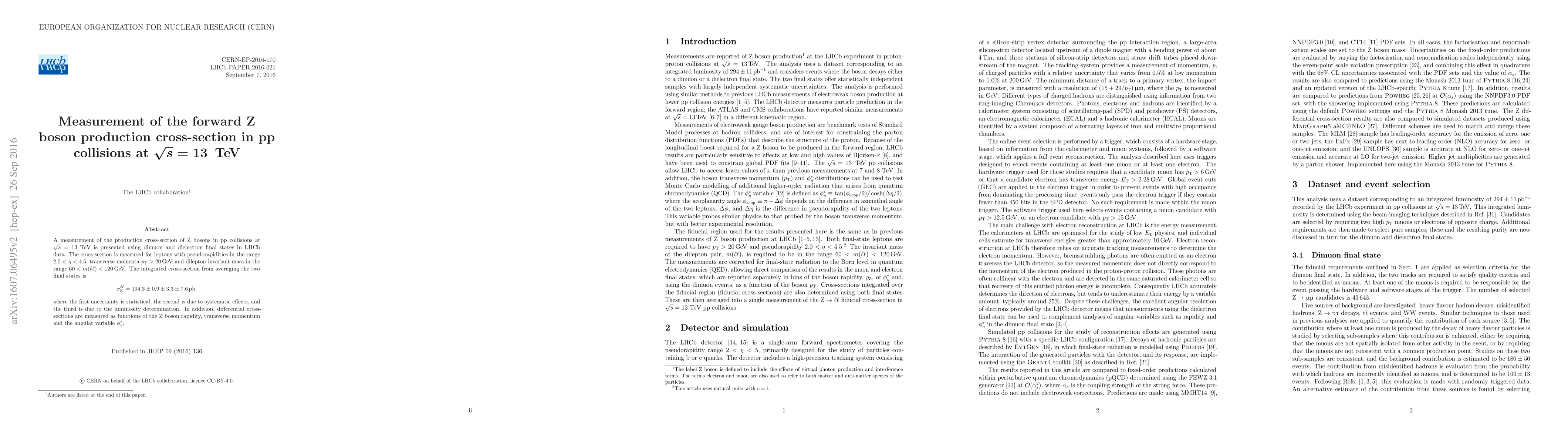 This paper reports the measurement of the forward Z boson production cross-section in proton-proton collisions at 13 TeV using LHCb data, focusing on dimuon and dielectron final states. The integrated cross-section is determined to be 194.3 ± 0.9 ± 3.3 ± 7.6 pb, with uncertainties from statistical, systematic, and luminosity sources.