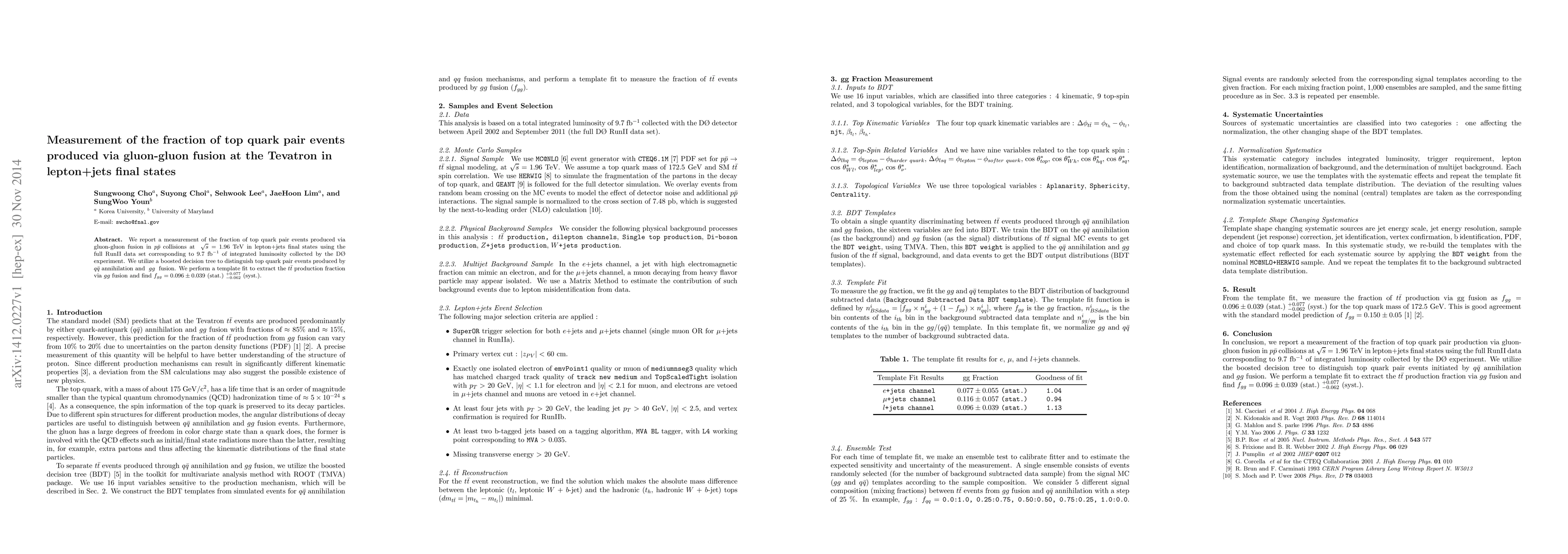 We report a measurement of the fraction of top quark pair events produced via gluon-gluon fusion in $p\bar{p}$ collisions at $\sqrt{s} = 1.96 ~\rm TeV$ in lepton+jets final states using the full RunII data set corresponding to $9.7 ~\rm fb^{-1}$ of integrated luminosity collected by the D\O\ experiment. We utilize a boosted decision tree to distinguish top quark pair events produced by $q\bar{q}$ annihilation and $gg$ fusion. We perform a template fit to extract the $t\bar{t}$ production fraction via $gg$ fusion and find $f_{gg} = 0.096 \pm 0.039 ~(\rm stat.) ~^{+0.077}_{-0.062} ~(\rm syst.)$.