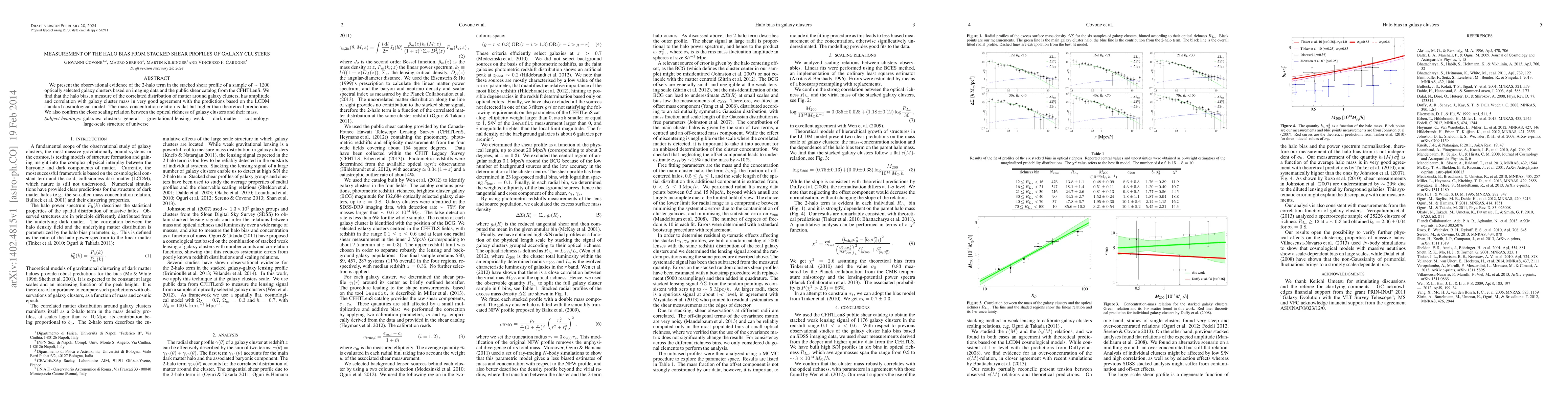 We present the observational evidence of the 2-halo term in the stacked shear profile of a sample of about 1200 optically selected galaxy clusters based on imaging data and the public shear catalog from the CFHTLenS. We find that the halo bias, a measure of the correlated distribution of matter around galaxy clusters, has amplitude and correlation with galaxy cluster mass in very good agreement with the predictions based on the LCDM standard cosmological model. The mass-concentration relation is flat but higher than theoretical predictions. We also confirm the close scaling relation between the optical richness of galaxy clusters and their mass.