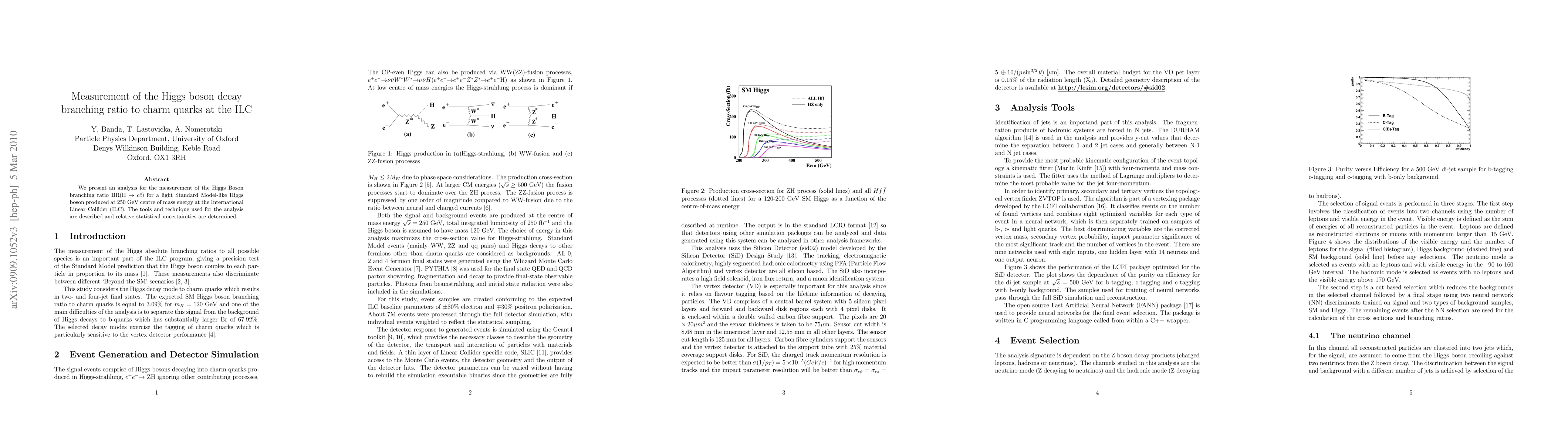 Summary: This study analyzes the measurement of the Higgs boson decay branching ratio to charm quarks at the International Linear Collider (ILC) for a 250 GeV Higgs boson, detailing the tools and techniques used, and assessing the associated uncertainties.