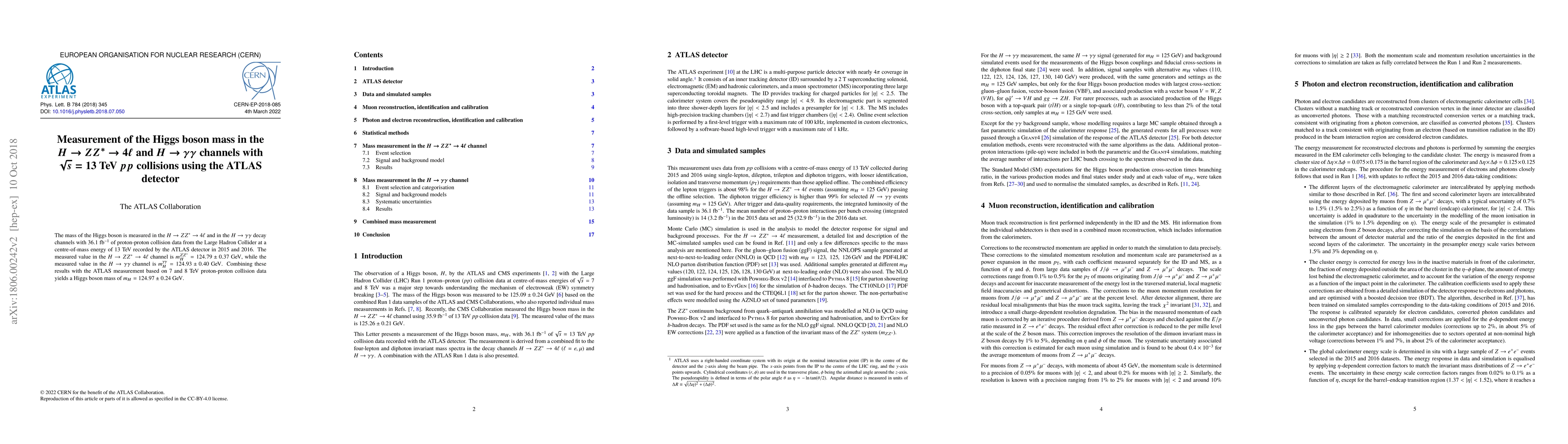 The ATLAS detector measures the Higgs boson mass in two decay channels: $H\rightarrow ZZ^* \rightarrow 4\ell$ and $H\rightarrow \gamma\gamma$, yielding $124.79 \pm 0.37$ GeV and $124.93 \pm 0.40$ GeV respectively, and combining these results gives a final mass of $124.97 \pm 0.24$ GeV.