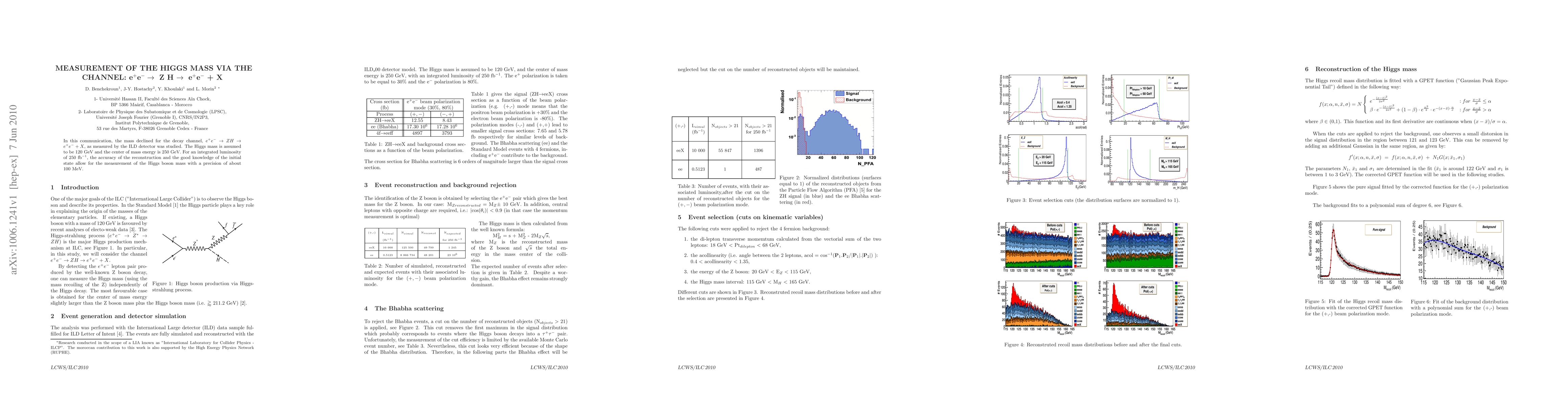 The International Large Detector (ILD) measured the Higgs boson mass via the channel e+e- -> ZH -> e+e- + X with an assumed Higgs mass of 120 GeV and a center-of-mass energy of 250 GeV. Achieving an integrated luminosity of 250 fb^-1, the ILD achieved a precision of approximately 100 MeV in Higgs mass reconstruction.