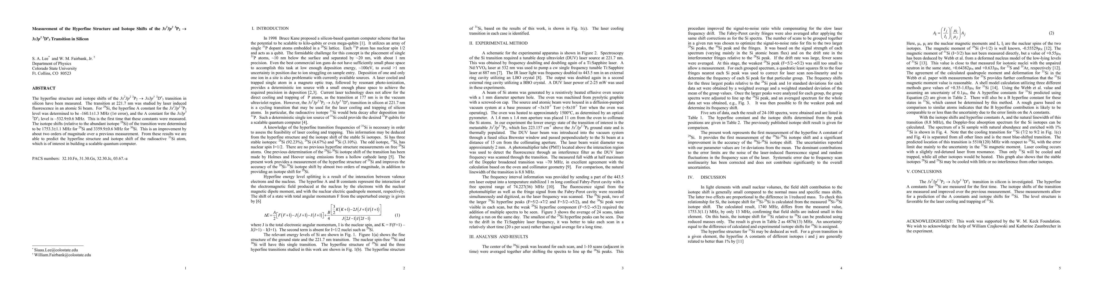 The paper presents the first measurement of hyperfine structure and isotope shifts for specific silicon transition states using laser-induced fluorescence in an atomic Si beam. Results for 29Si and 30Si show improved precision compared to previous measurements, enabling predictions for the hyperfine structure and isotope shift of the radioactive 31Si, crucial for quantum computing applications.