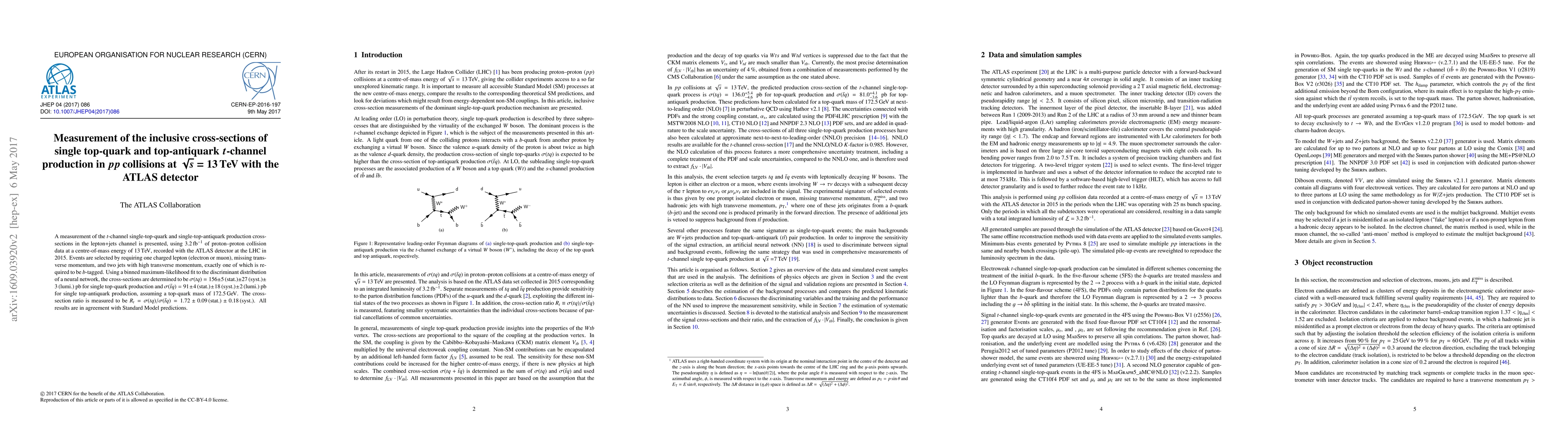 This paper reports measurements of $t$-channel single top-quark and top-antiquark production cross-sections using 3.2 fb$^{-1}$ of LHC proton-proton collision data at 13 TeV. The cross-sections are determined to be 156 ± 5 ± 27 ± 3 pb for single top-quark and 91 ± 4 ± 18 ± 2 pb for single top-antiquark production.