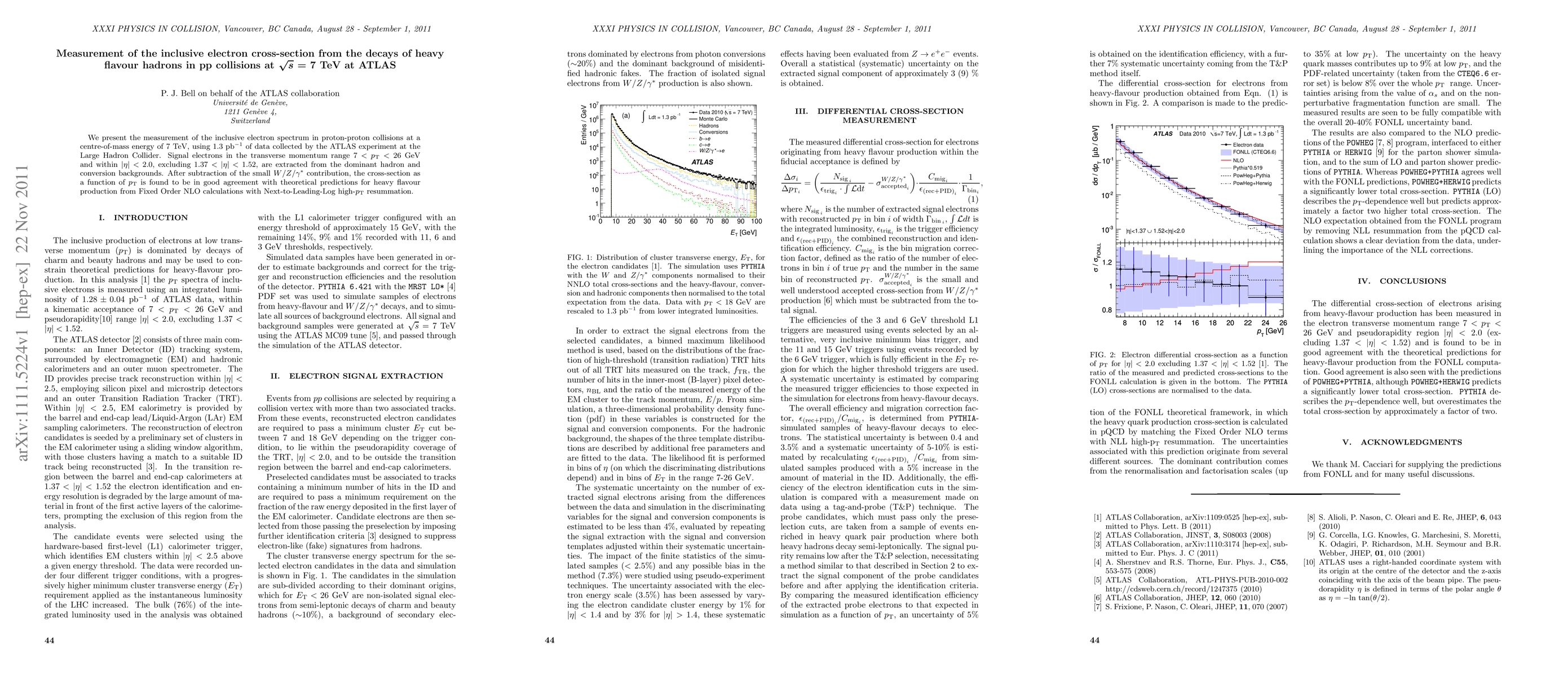 We present the measurement of the inclusive electron spectrum in proton-proton collisions at a centre-of-mass energy of 7 TeV, using 1.3 pb-1 of data collected by the ATLAS experiment at the Large Hadron Collider. Signal electrons in the transverse momentum range 7 < pt < 26 GeV and within |eta| <2.0, excluding 1.37<|eta|<1.52, are extracted from the dominant hadron and conversion backgrounds. After subtraction of the small W/Z/gamma* contribution, the cross-section as a function of pt is found to be in good agreement with theoretical predictions for heavy flavour production from Fixed Order NLO calculations with Next-to-Leading-Log high pt resummation.