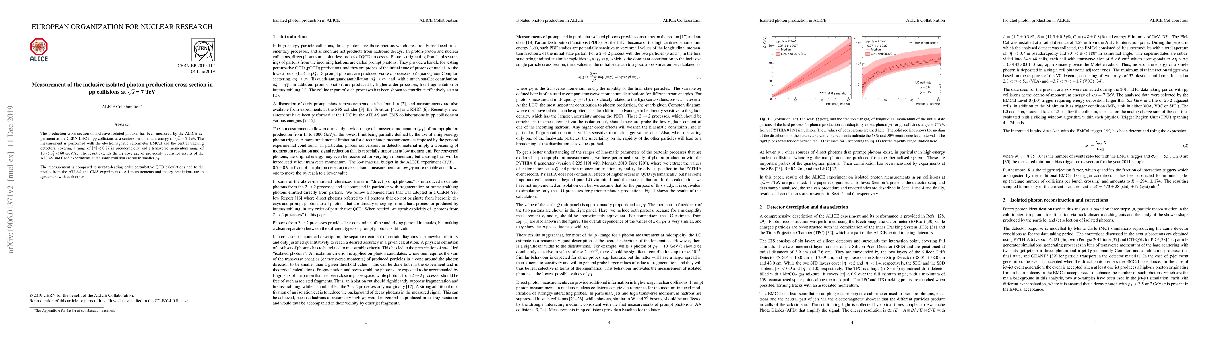 The ALICE experiment at CERN LHC measured the inclusive isolated photon production cross section in pp collisions at $\sqrt{s}=7$ TeV, extending the $p_{\rm T}$ coverage to lower values compared to ATLAS and CMS results. The results align with next-to-leading order perturbative QCD calculations and previous experimental data.