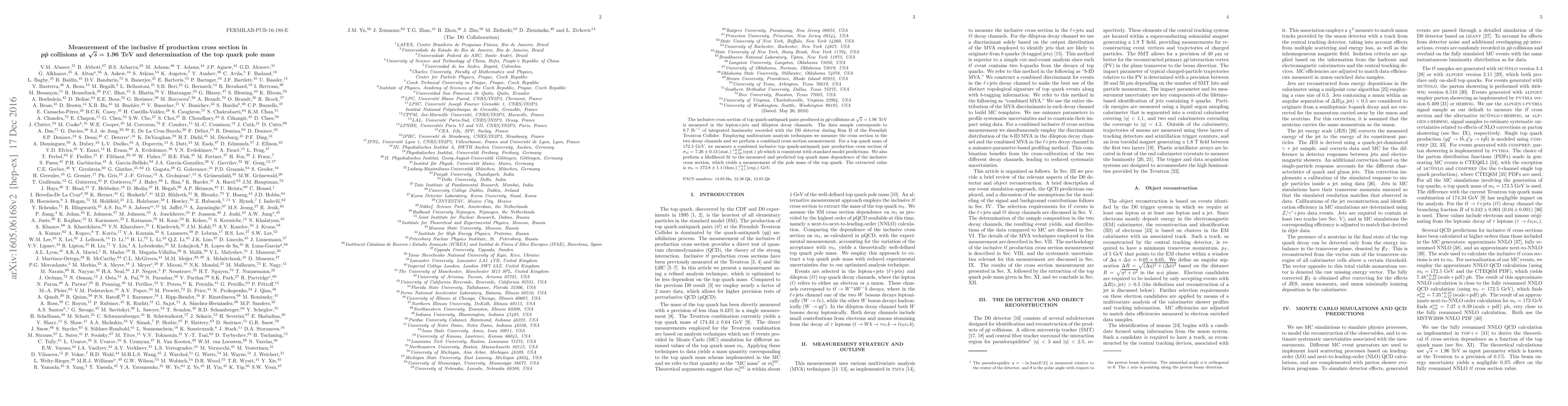This paper measures the inclusive $t\bar{t}$ production cross section in $p\bar{p}$ collisions at $\sqrt{s}=1.96$ TeV using data from the D0 detector, yielding $\sigma_{t\bar{t}} = 7.26 \pm 0.13\,(\mathrm{stat.})\,^{+0.57}_{-0.50}\,(\mathrm{syst.})$ pb, consistent with predictions. It also determines the top quark pole mass as $m_t = 172.8 \pm 1.1\,(\mathrm{theo.})\,^{+3.3}_{-3.1}\,(\mathrm{exp.})$ GeV.