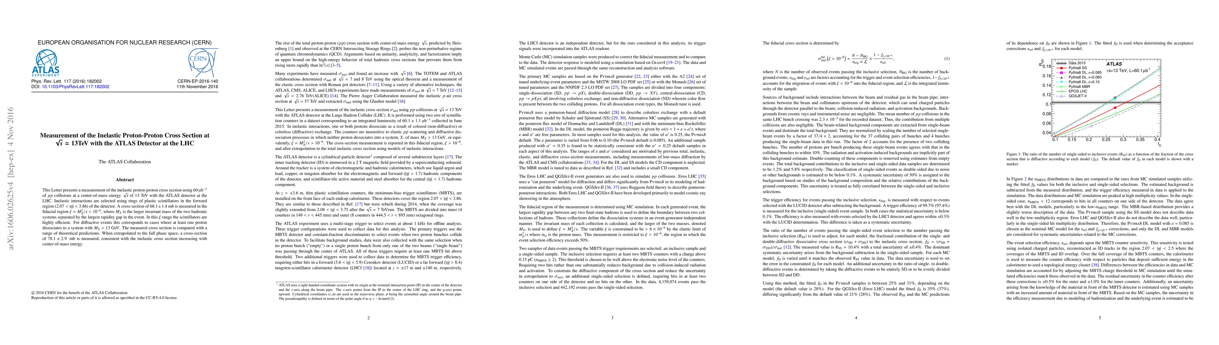 This paper reports a measurement of the inelastic proton-proton cross section at $\sqrt{s} = 13$ TeV using the ATLAS detector, finding a value of $68.1 \pm 1.4$ mb in a specific fiducial region, and compares it to theoretical predictions.