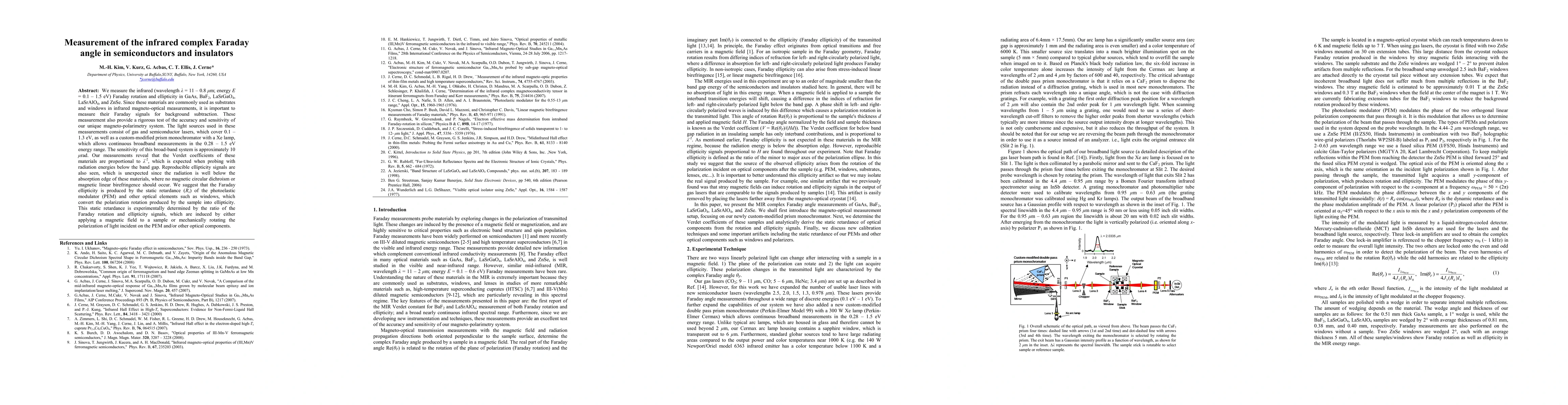 We measure the infrared (wavelength 11 - 0.8 microns; energy E = 0.1 - 1.5 eV) Faraday rotation and ellipticity in GaAs, BaF2, LaSrGaO4, LaSrAlO4, and ZnSe. Since these materials are commonly used as substrates and windows in infrared magneto-optical measurements, it is important to measure their Faraday signals for background subtraction. These measurement also provide a rigorous test of the accuracy and sensitivity of our unique magneto-polarimetry system. The light sources used in these measurements consist of gas and semiconductor lasers, which cover 0.1 - 1.3 eV, as well as a custom-modified prism monochromator with a Xe lamp, which allows continuous broadband measurements in the 0.28 - 1.5 eV energy range. The sensitivity of this broad-band system is approximately 10 micro-rad. Our measurements reveal that the Verdet coefficients of these materials are proportional to $1/\lambda^2$, which is expected when probing with radiation energies below the band gap. Reproducible ellipticity signals are also seen, which is unexpected since the radiation is well below the absorption edge of these materials, where no magnetic circular dichroism or magnetic linear birefringence should occur. We suggest that the Faraday ellipticity is produced by the static retardance (Rs) of the photoelastic modulator (PEM) and other optical elements such as windows, which convert the polarization rotation produced by the sample into ellipticity. This static retardance is experimentally determined by the ratio of the Faraday rotation and ellipticity signals, which are induced by either applying a magnetic field to a sample or mechanically rotating the polarization of light incident on the PEM and/or other optical components.
