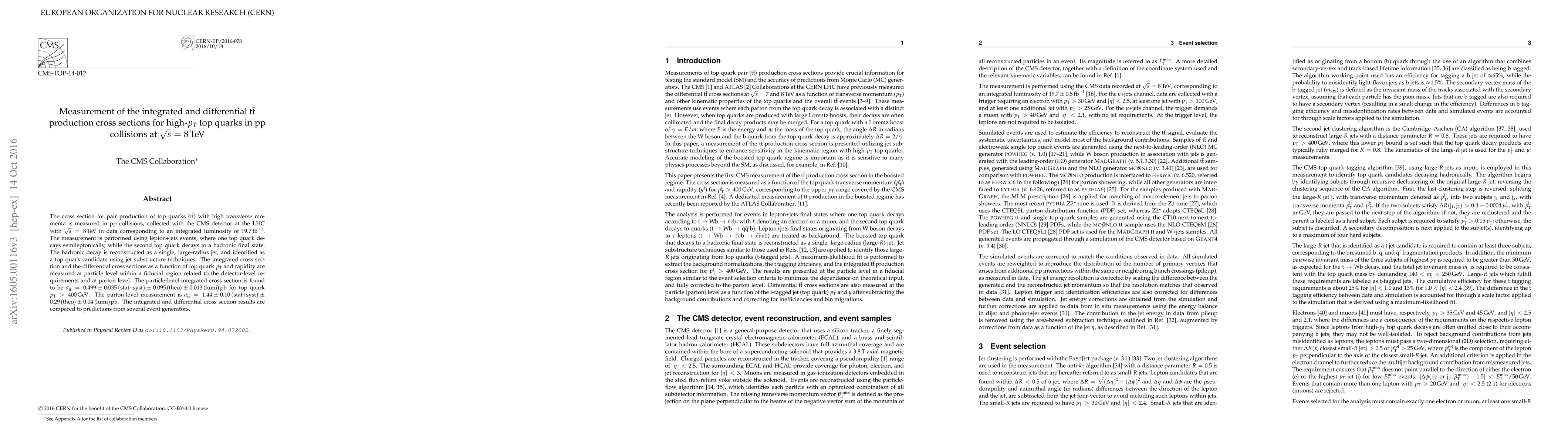 This paper measures the integrated and differential cross sections for top quark pair production (t-tbar) in high-energy proton-proton collisions at 8 TeV using the CMS detector at the LHC. The results show an integrated cross section of 0.499 ± 0.035 pb for top quarks with transverse momentum greater than 400 GeV, compared to theoretical predictions.