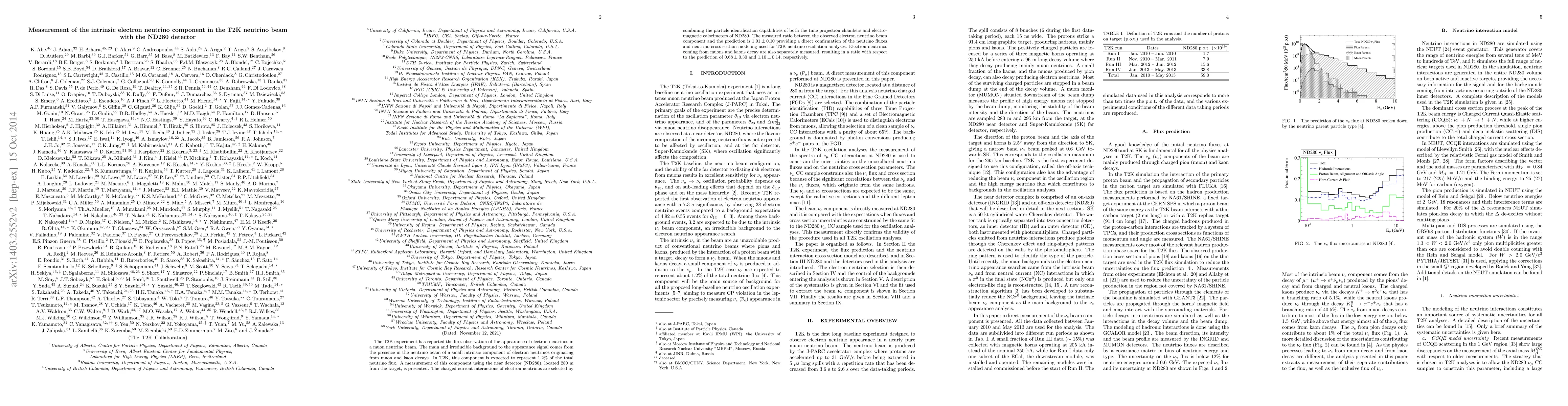 The T2K experiment measured the intrinsic electron neutrino component in its beam using the ND280 detector, confirming the predicted 1.2% electron neutrino flux from muon and kaon decays. The observed ratio of 1.01±0.10 validates T2K's neutrino flux and cross-section models.