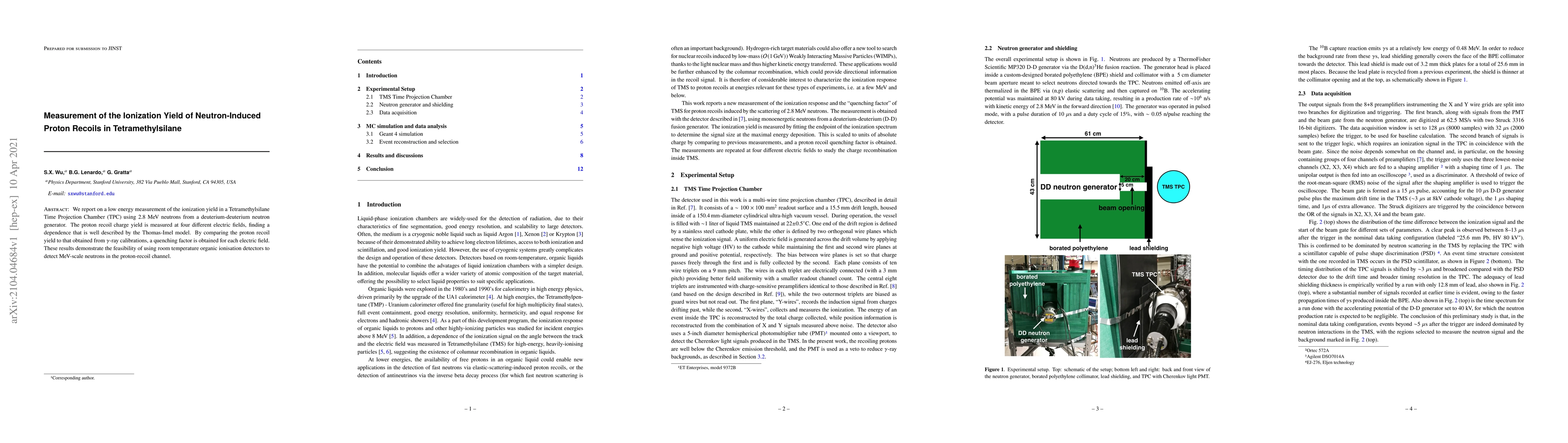 We report on a low energy measurement of the ionization yield in a Tetramethylsilane Time Projection Chamber (TPC) using 2.8 MeV neutrons from a deuterium-deuterium neutron generator. The proton recoil charge yield is measured at four different electric fields, finding a dependence that is well described by the Thomas-Imel model. By comparing the proton recoil yield to that obtained from $\gamma$-ray calibrations, a quenching factor is obtained for each electric field. These results demonstrate the feasibility of using room temperature organic ionisation detectors to detect MeV-scale neutrons in the proton-recoil channel.