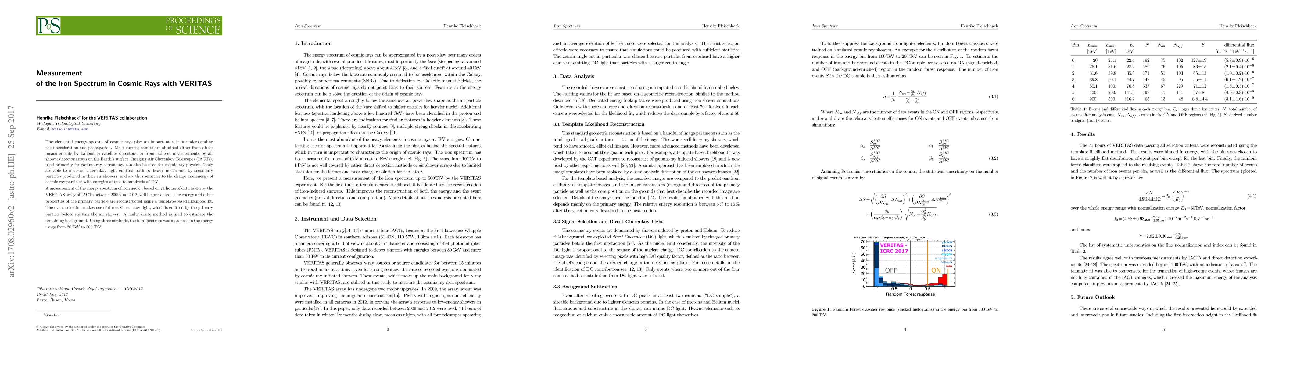 The elemental energy spectra of cosmic rays play an important role in understanding their acceleration and propagation. Most current results are obtained either from direct measurements by balloon or satellite detectors, or from indirect measurements by air shower detector arrays on the Earth's surface. Imaging Air Cherenkov Telescopes (IACTs), used primarily for gamma-ray astronomy, can also be used for cosmic-ray physics. They are able to measure Cherenkov light emitted both by heavy nuclei and by secondary particles produced in their air showers, and are thus sensitive to the charge and energy of cosmic ray particles with energies of tens to hundreds of TeV. A measurement of the energy spectrum of iron nuclei, based on 71 hours of data taken by the VERITAS array of IACTs between 2009 and 2012, will be presented. The energy and other properties of the primary particle are reconstructed using a template-based likelihood fit. The event selection makes use of direct Cherenkov light, which is emitted by the primary particle before starting the air shower. A multivariate method is used to estimate the remaining background. Using these methods, the iron spectrum was measured in the energy range from 20 TeV to 500 TeV.