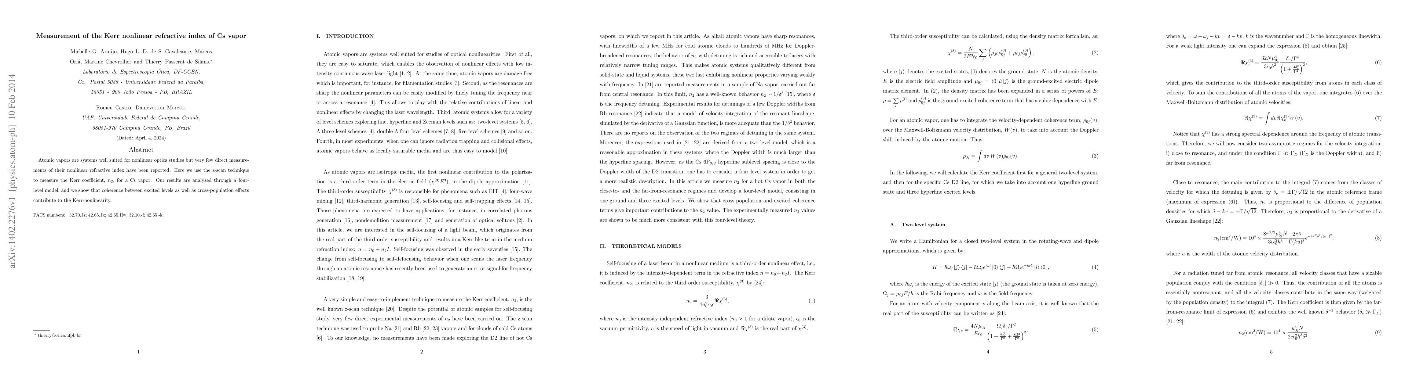 This study measures the Kerr nonlinear refractive index of cesium vapor using the z-scan technique, revealing contributions from coherence between excited levels and cross-population effects to the observed Kerr-nonlinearity.