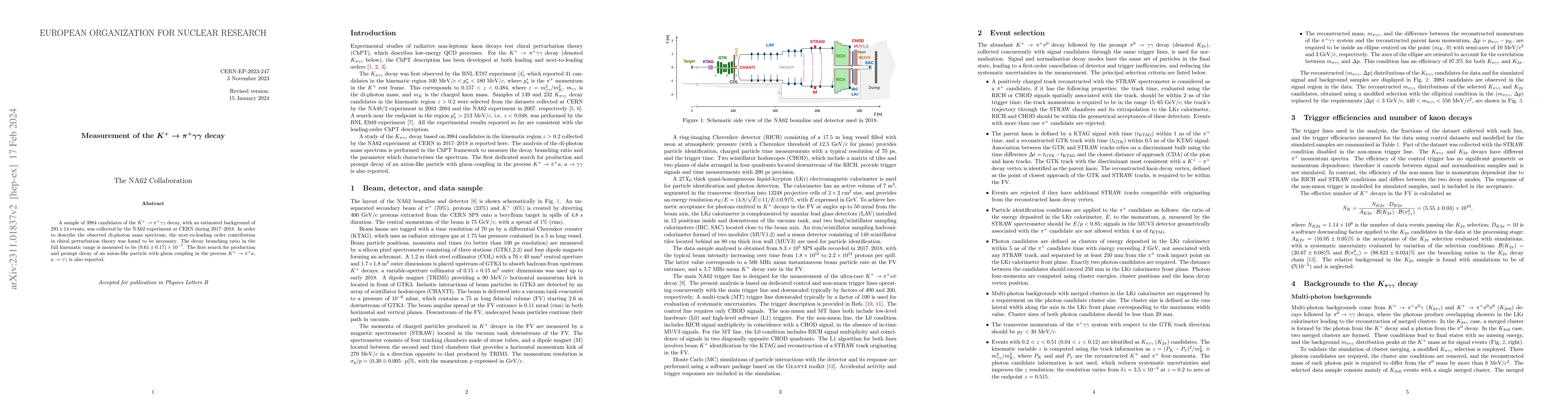 The NA62 experiment at CERN measured the branching ratio of the $K^+\to\pi^+\gamma\gamma$ decay to $(9.61\pm0.17)\times10^{-7}$, employing next-to-leading order chiral perturbation theory for the di-photon mass spectrum. Additionally, the study reports the first search for axion-like particles in the $K^+\to\pi^+a$, $a\to\gamma\gamma$ process.