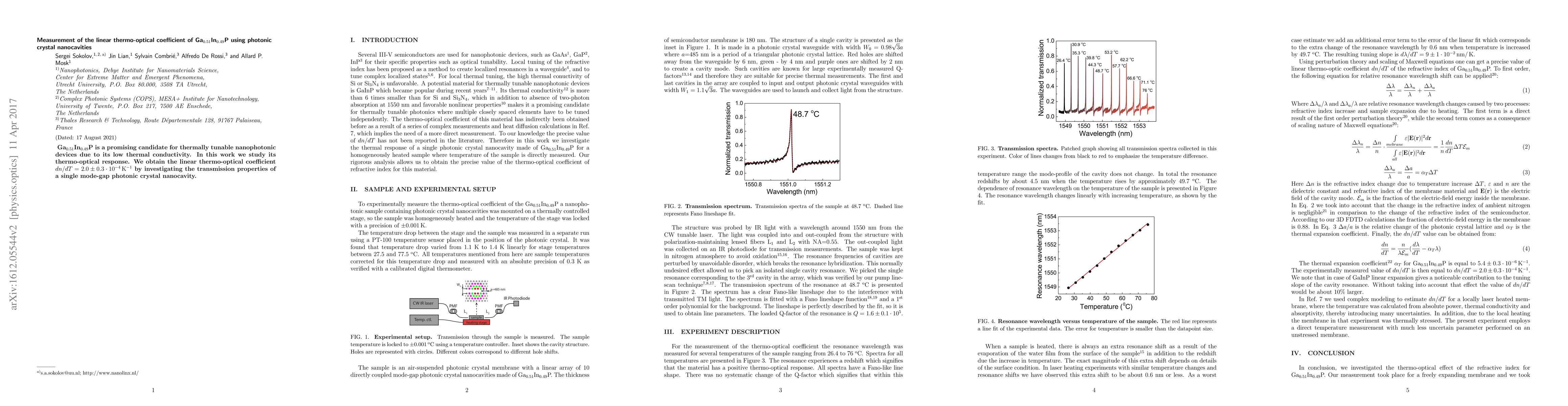 Summary: The linear thermo-optical coefficient of Ga$_{0.51}$In$_{0.49}$P was measured to be $2.0\pm0.3\cdot 10^{-4}\,\rm{K}^{-1}$ using photonic crystal nanocavities, indicating its suitability for thermally tunable nanophotonic devices.