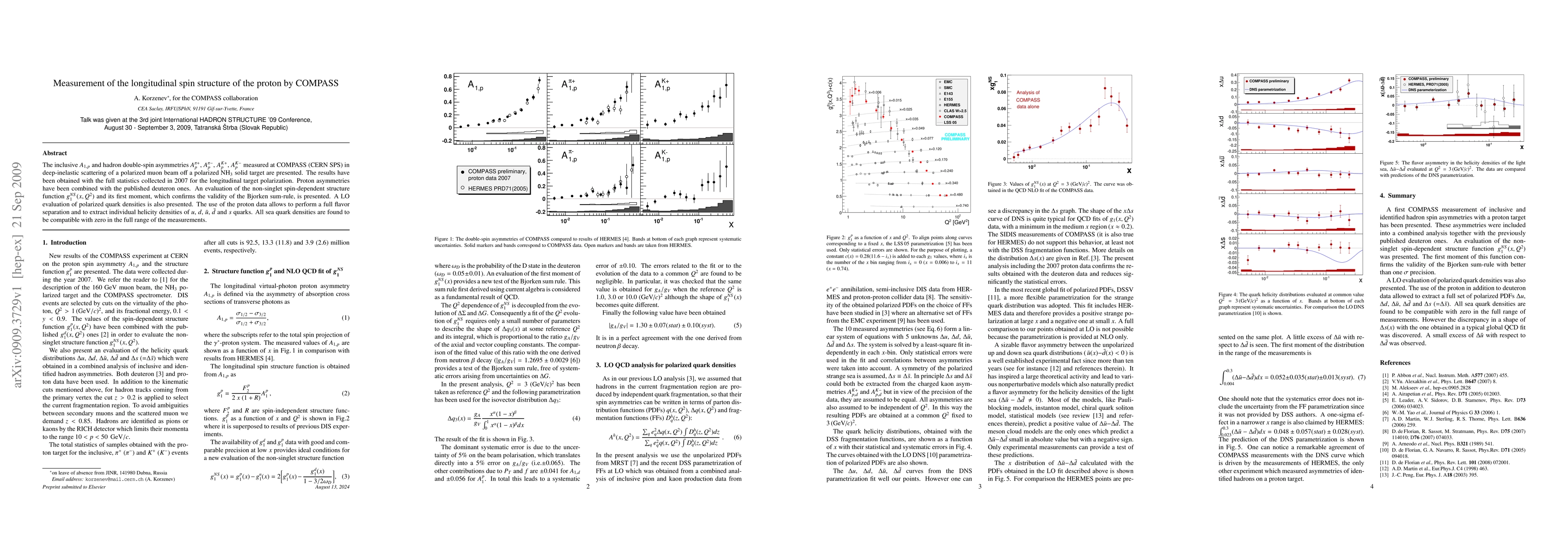 The COMPASS experiment at CERN measured proton's spin structure using polarized muon beams and ammonia targets, obtaining inclusive asymmetries A_1,p and hadron asymmetries. Combining these with previous deuteron results, they evaluated the non-singlet structure function g_1^NS(x,Q^2), confirming the Bjorken sum-rule. They also performed a low-order evaluation of polarized quark densities, achieving flavor separation for u, d, anti-u, anti-d, and s quarks, finding that all sea quark densities are near zero in the measured range.