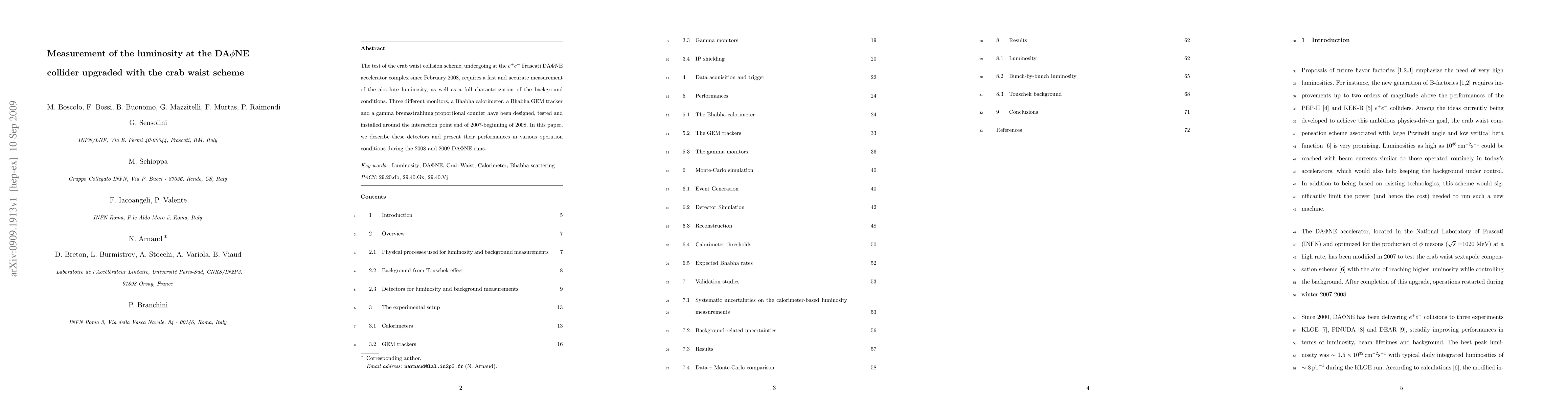 This paper details the implementation of three novel detectors—a Bhabha calorimeter, a Bhabha GEM tracker, and a gamma bremsstrahlung proportional counter—to measure luminosity at the DAFNE collider, which has adopted the crab waist collision scheme. The performance of these detectors is evaluated during the 2008 and 2009 runs.
