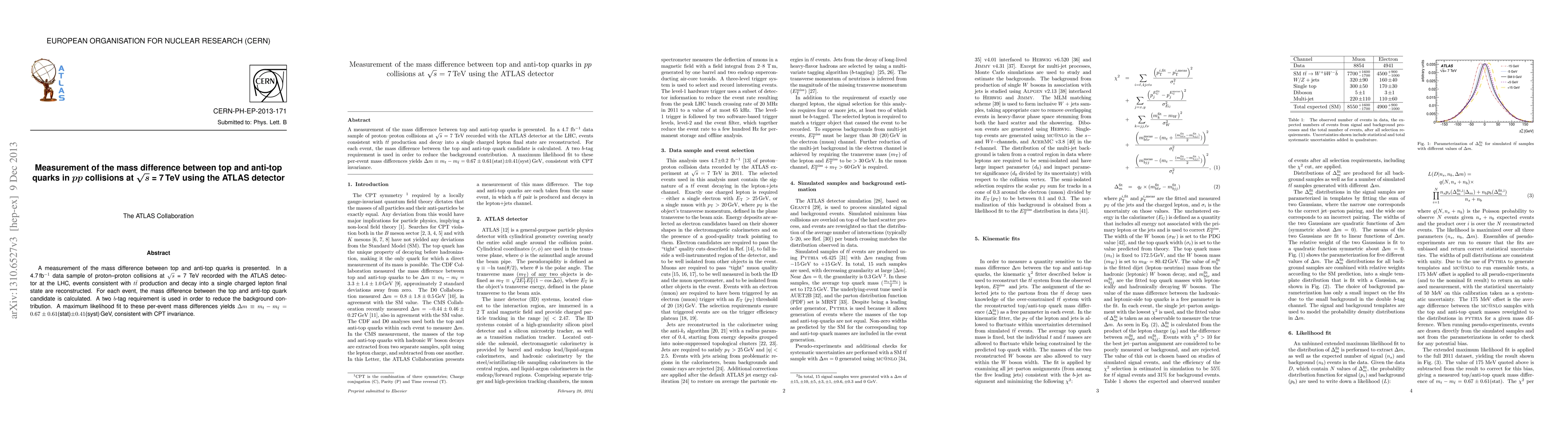 This study measures the mass difference between top and anti-top quarks in proton-proton collisions at 7 TeV using the ATLAS detector, finding mt-mtbar = 0.67 ± 0.61 (stat) ± 0.41 (syst) GeV, consistent with CPT invariance. The analysis utilizes a 4.7 fb-1 data sample and a two b-tag requirement to minimize background.