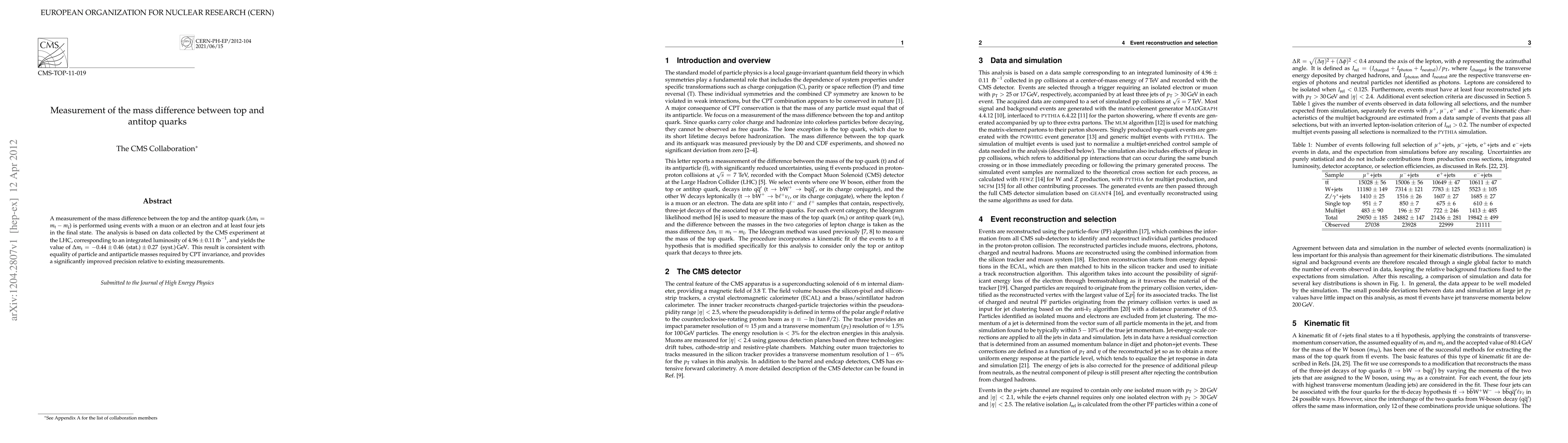 The CMS experiment at the LHC measured the mass difference between top and antitop quarks, finding Delta m(t) = -0.44 +/- 0.46 (stat) +/- 0.27 (syst) GeV, consistent with CPT invariance and offering improved precision over previous results.