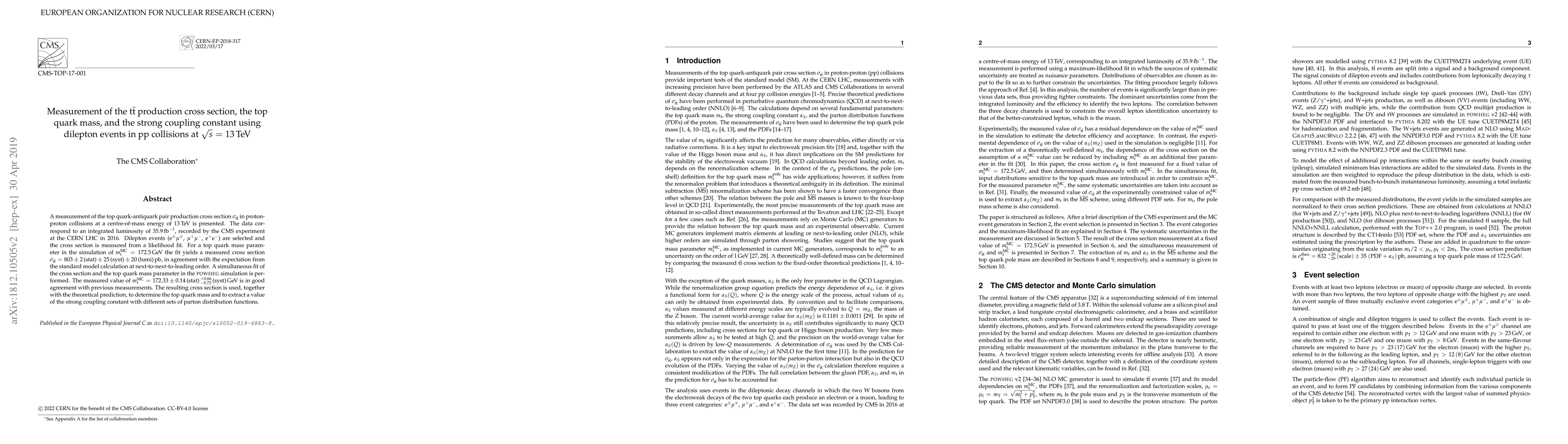 This paper measures the top quark-antiquark pair production cross section using dilepton events from proton-proton collisions at 13 TeV, yielding a cross section of 803 ± 2 pb. The top quark mass is determined to be 172.33 ± 0.14 GeV, and the strong coupling constant is extracted using various parton distribution functions.