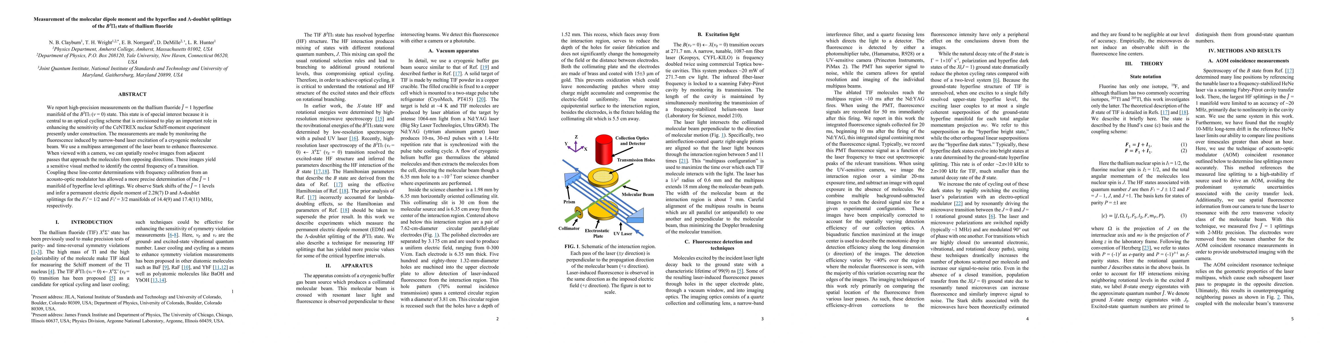 We report high-precision measurements on the thallium fluoride $\tilde{J} = 1$ hyperfine manifold of the $B^3\Pi_1$ ($\nu = 0$) state. This state is of special interest because it is central to an optical cycling scheme that is envisioned to play an important role in enhancing the sensitivity of the CeNTREX nuclear Schiff-moment experiment presently under construction. The measurements are made by monitoring the fluorescence induced by narrow-band laser excitation of a cryogenic molecular beam. We use a multipass arrangement of the laser beam to enhance fluorescence. When viewed with a camera, we can spatially resolve images from adjacent passes that approach the molecules from opposing directions. These images yield a sensitive visual method to identify the central frequency of a transition. Coupling these line-center determinations with frequency calibration from an acousto-optic modulator has allowed a more precise determination of the $\tilde{J} = 1$ manifold of hyperfine level splittings. We observe Stark shifts of the $\tilde{J} = 1$ levels and infer a permanent electric dipole moment of 2.28(7) D and $\Lambda$-doublet splittings for the $F_1' = 1/2$ and $F_1' = 3/2$ manifolds of 14.4(9) MHz and 17.4(11) MHz, respectively.