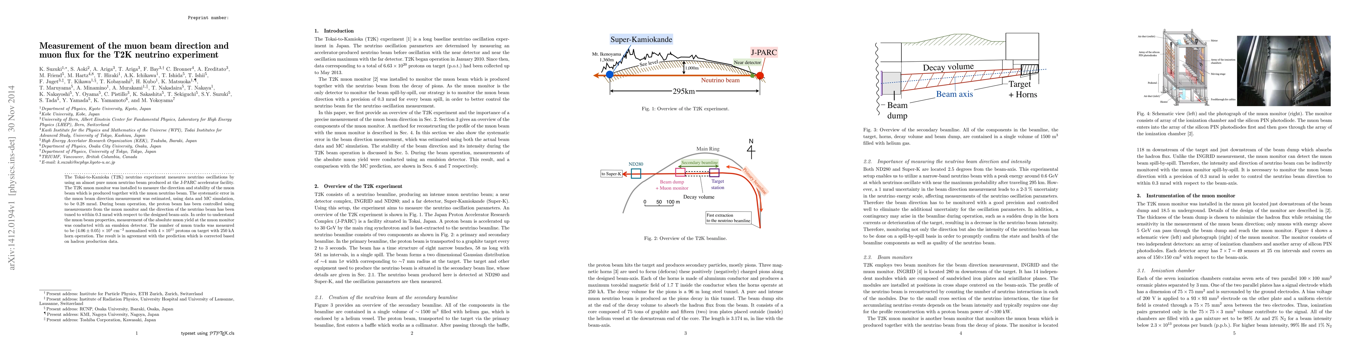 The T2K experiment measures neutrino oscillations using a muon neutrino beam, with a systematic error in the muon beam direction of 0.28 mrad. The muon flux was determined to be $(4.06\pm0.05)\times10^4$ cm$^{-2}$ normalized with $4\times10^{11}$ protons on target, matching predictions corrected by hadron production data.