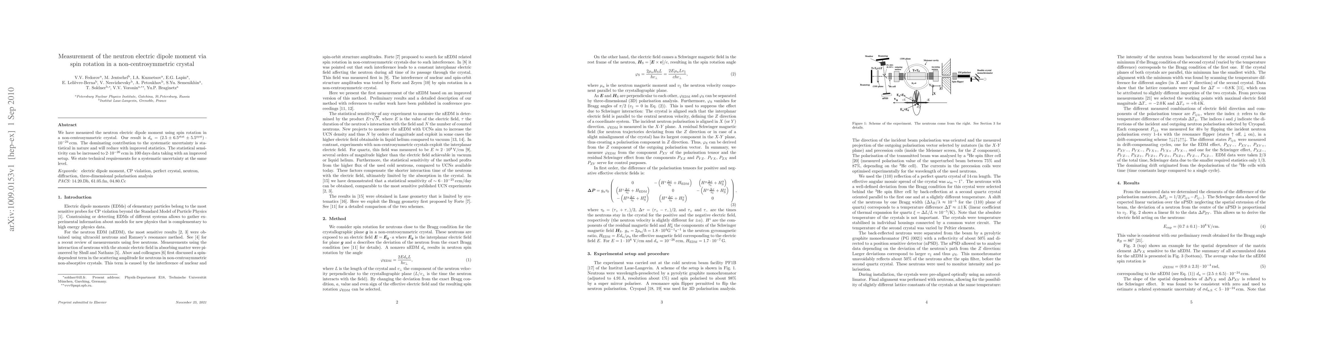 Researchers measured the neutron electric dipole moment using spin rotation in a non-centrosymmetric crystal, achieving a precision of 10^-24 e cm, with plans to improve sensitivity further.